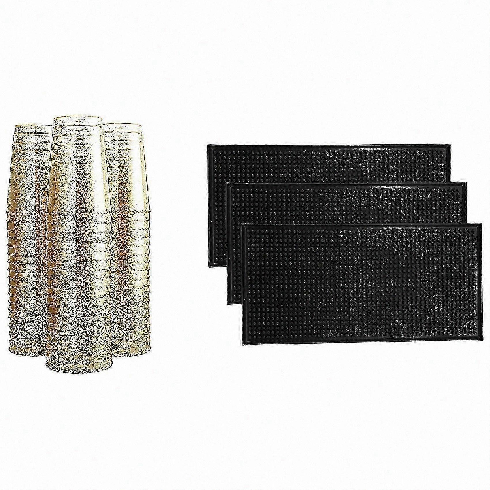 50Pcs 10OZ Disposable Gold Glitter Plastic Cups & 3 Pcs Bar Mat Spill Mat Glass Drying Mat Cocktail