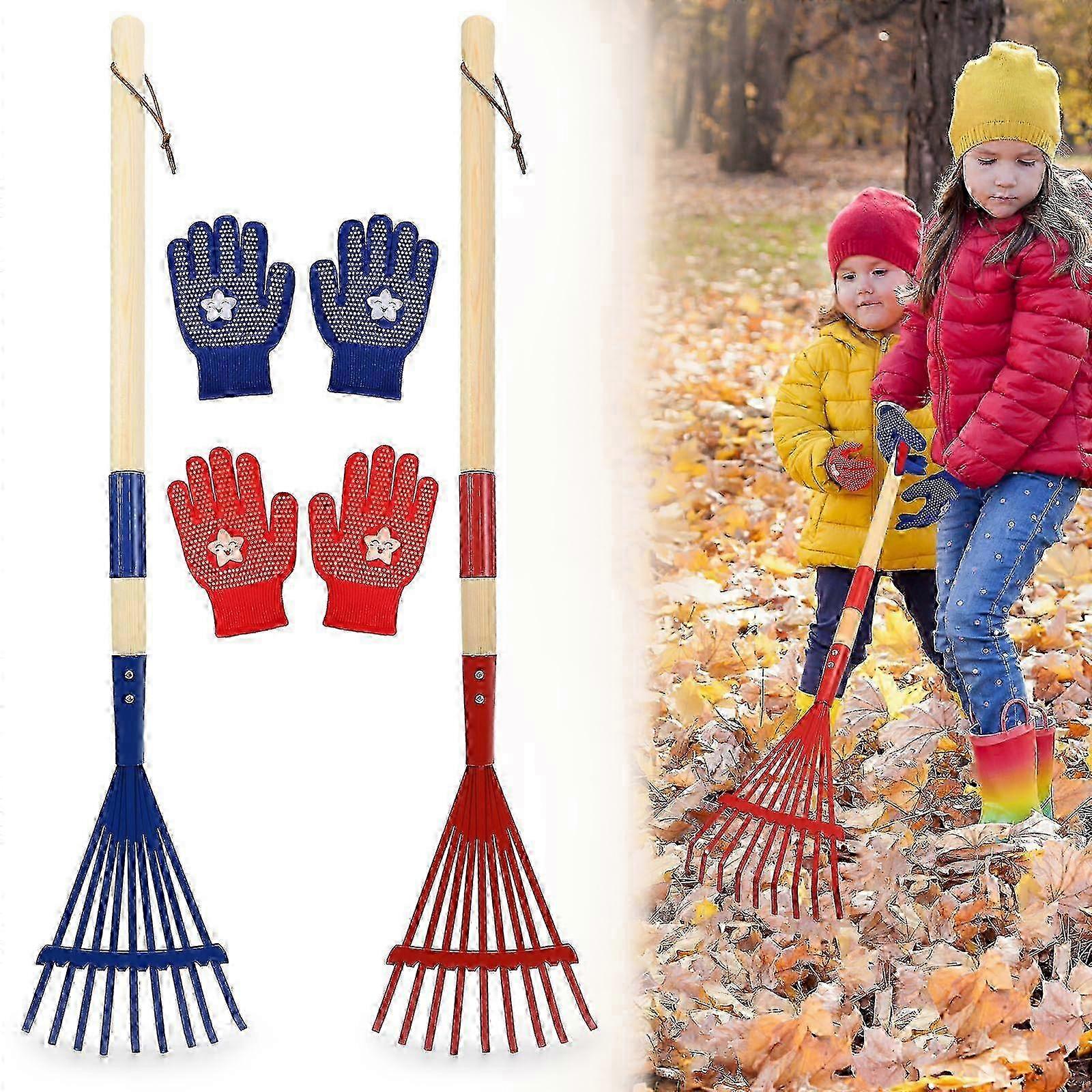 50% Off-Metal Kids Leaves Rakes and Kids Gloves Small Kids Lawn Rakes with Wooden Handle
