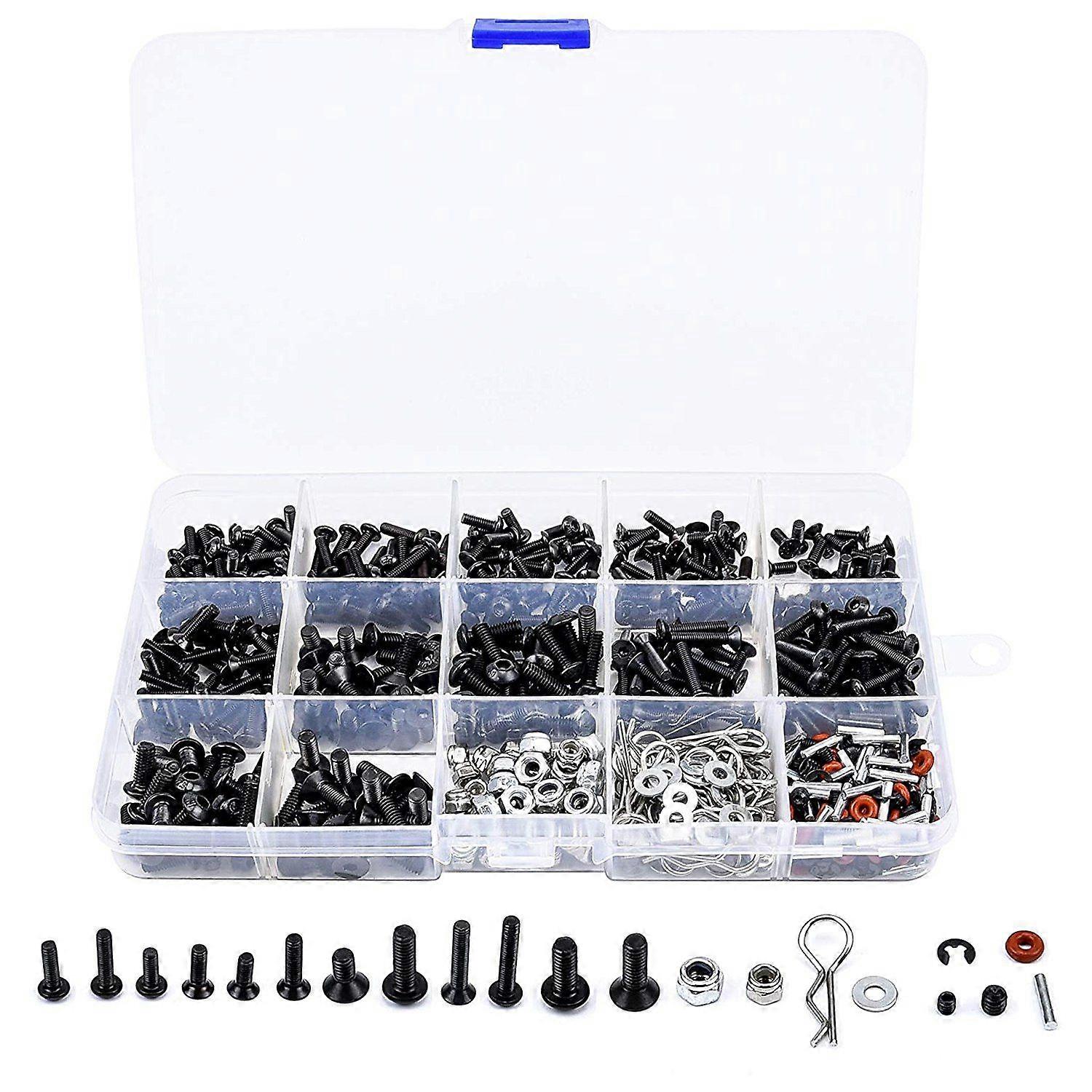 500pcs in total,M3//E Buckle/Car Shell Buckle/Screw Nuts/Hex Screws/Plugs. Various Size Screws for for RC Models,meet your various needs. A must have for your RC Vehicles Trucks , Short Course,Crawlers, On-Road,Off Road,etc. Compatible with 1/10 Scale Models,Such as / etc. Come with Transparent Box,Keep your screws organised Easy to take and use. m3 x 3 screw x 20pcs x 4 screw x 20pcs E buckle x 20pcs Car Shell buckle x 20pcs screw nuts x 20pcs m3 screw nuts x 20pcs Anti-shedding ring x 20pcs m3 gasket x 20pcs m2 x 10 bolt x 20pcs Hexagon screw Round head 3 x 16 / 3 x 12 / 3 x 10 / 3 x 8 each for 30pcs Flat Head 3 x 16 / 3 x 12 / 3 x 10 / 3 x 8 Each for 30pcs Flat head 4 x 8 / 4 x 12 / each for 20pcs Round head 4 x 12 /4 x 10 /each for 20pcs Total 500pcs a box Color: black+silver material: metal Package Contents: 500PCS RC Car Screws Kit Only the above package content, other products are not included. Note: Light reflection and different displays may cause the color of the item in the picture a little different from the real thing. The measurement allowed error is +/- 1-3cm.