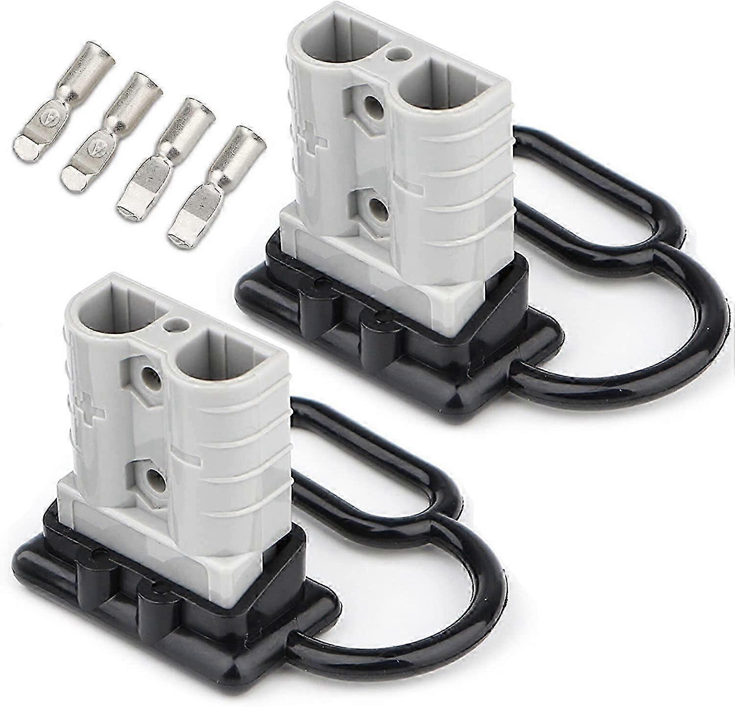 Wide Compatibility - Fits 6-10 gauge cables Voltage 12-36V 50Apm capacity Super easy to use- Put the wire into the terminal pins then solder or clamp them. Then slide them to the back of the plug and lock them to complete this procedure Strong electrical conductivity - A connector comes with 2 pins. They are made from silver coated red copper, which offers high conductivity and produces less heat Allows quick connection and disconnection for winches or other electrical devices