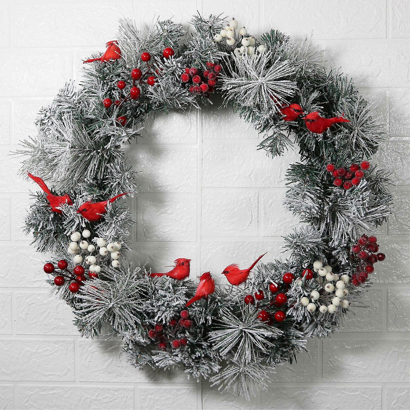 55cm Christmas Wreath Red Bishop Flocked Pine Needle Berry Garland Festive Hanging Decor