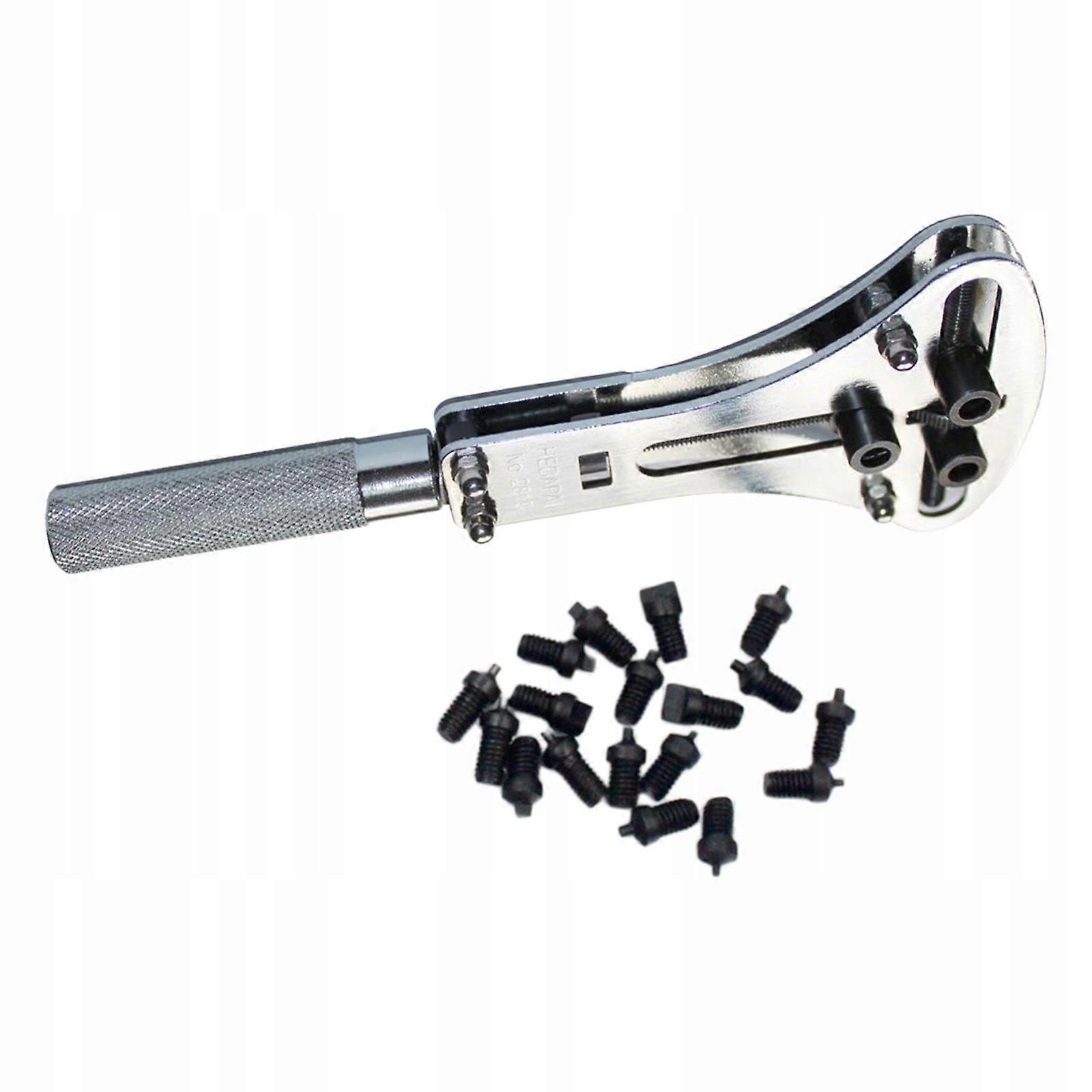 Watch Waterproof Repair Tool Rear Battery Cover Key Opener for Screw Removal Description: High quality watch case opener for different. The expandable range of this three-pin box opener is max. 55 mm. It features a knurled handle for better grip and an adjustable scroll wheel. Keeps the watch in 3 positions. With this adjustable opening case, you can easily open the back case of your watch. Includes 6 sets of different types of handles, the handles will work on polygonal, slotted, hole and grooved housing. Fits most screw-on enclosures. Ideal for opening watch cases, adjusting, replacing watch batteries, gaskets, adjusting straps and more. Very convenient and easy to take anywhere and easy to use, suitable for professional and home use. Specifications: Material: metal Size: 16.5x7cm/6.5x2.8 inch The package includes: 1 piece watch case opening key 18 pieces of pins (6 sets of 3 pins)