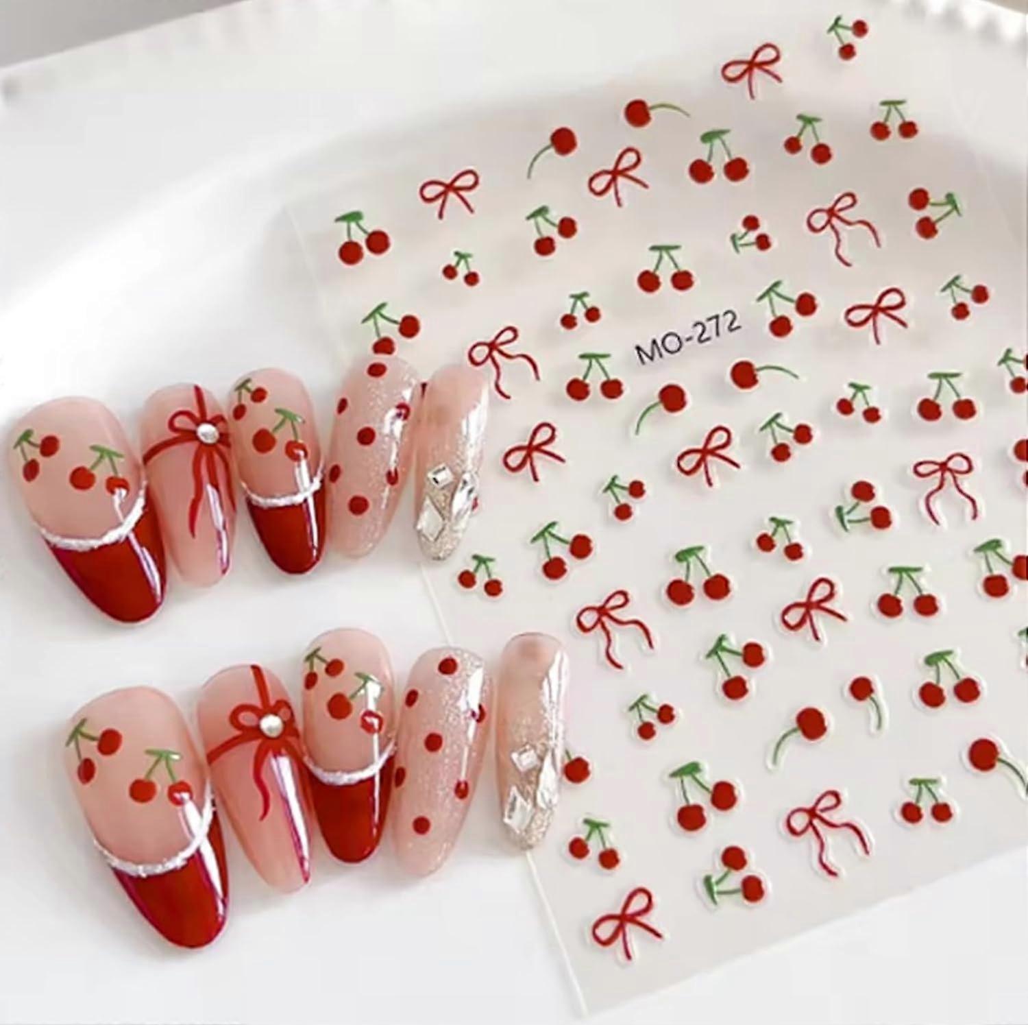 5D embossed cherry nail stickers, summer fruit design, self-adhesive.