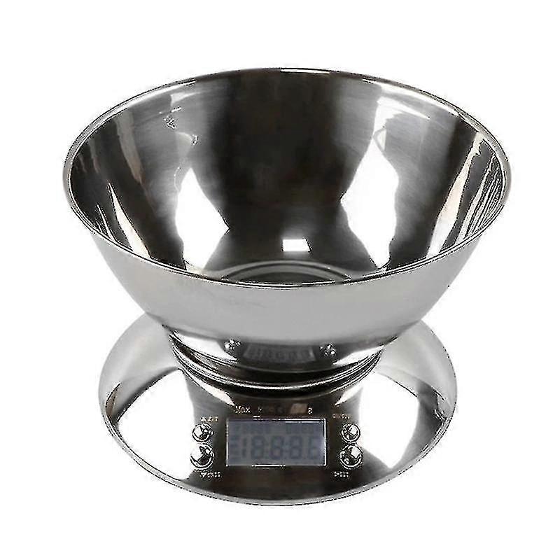 Product Product size: 215*145mmWeighing range: 1g-5000gUnit: g/lb/ozProduct gross weight: 710 gBattery consumption: 2 AAA batteries (not included)Display mode: LCD backlightPackage Includes: 1*kitchen scale1*instruction manual Description: Large capacity and high-precision sensors: the kitchen scale max weights up to 5000g, perfect for baking, cooking, postage, jewellery, powdered milk, fruit, vegetables, stamps, etc. 2.More functions: precision tare function subtracts the weight of the container for the net weight of the ingredients or liquids; The tare function can also weigh liquids and ingredients in containers. Automatic Unit button instantly converts between 4 measurement units (kg, g, lb, oz).MORE FUNCTIONS: Precision tare function subtracts the weight of the container for the net weight of the ingredient or liquid; The tare function can also weigh liquids and ingredients in containers. Automatic Unit button instantly converts between 4 measurement units (kg, g, lb, oz).High quality brushed finish with stainless steel bowl for detachable use. Made of stainless steel, the design is elegant and easy to clean.With large LCD display, white backlight, quick and easy to read. Built-in temperature sensor to test changes in the environment.Low Energy: The digital kitchen scale with low battery, overload indicator, will automatically turn off when the display shows 0" or the same number for 120 seconds to save battery life.