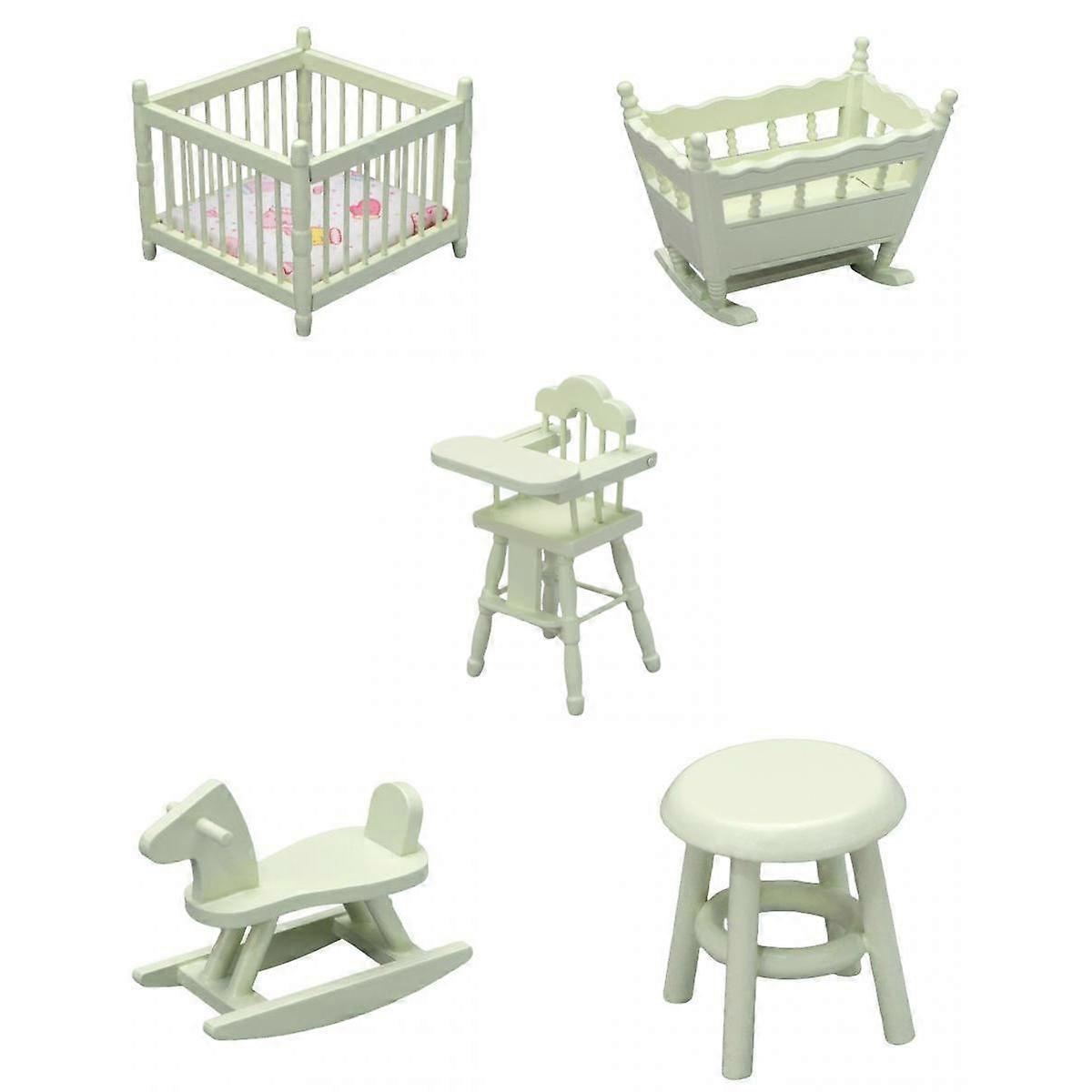 Description: Attractive dollhouse bedroom set,carved from birch wood, and safe. The design is simple and noble,has a strong texture and meticulous workmanship. Exquisite design, perfect for your dollhouse scene. Great decoration for your 1:12 miniature doll house room scene accessory,creating a lively and warm atmosphere. Best DIY gifts for kids to dress up beloved dollhouse.also can be photography props,increasing atmosphere. Size Chart: Baby bed LxWxH: 8.8x8.8x7.1cm / 3.46x3.46x2.79inch Cradle LxWxH: 9.5x5.7x7.3cm / 3.74x2.24x2.87inch Dining chair LxWxH: 4.7x4.3x10cm / 1.85x1.69x3.93inch Little wooden horse LxWxH: 7x3.5x5.8cm / 2.75x1.37x2.28inch Stool LxWxH: 3.6x3.6x3.6cm / 1.41x1.41x1.41inch Package Includes: 5 Pieces 1/12 Dollhouse Furniture Set Note: Color might be slightly different due to the color calibration of each individual monitor. Please allow slightly measuring deviation due to manual measurement. This is not infant toy,please take away from kids to avoid eating.