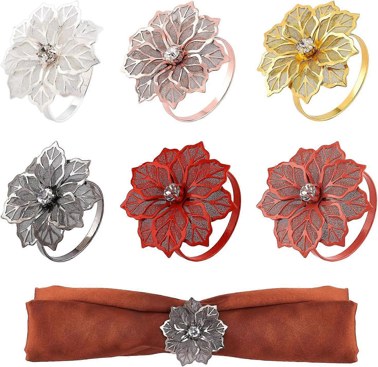 6 Styles Alloy Napkin Rings Set of 12 Hollow Out Flower Napkin Ring Holders Rhinestone Flower Holiday Serviette Buckles Table Decor for Wedding Party