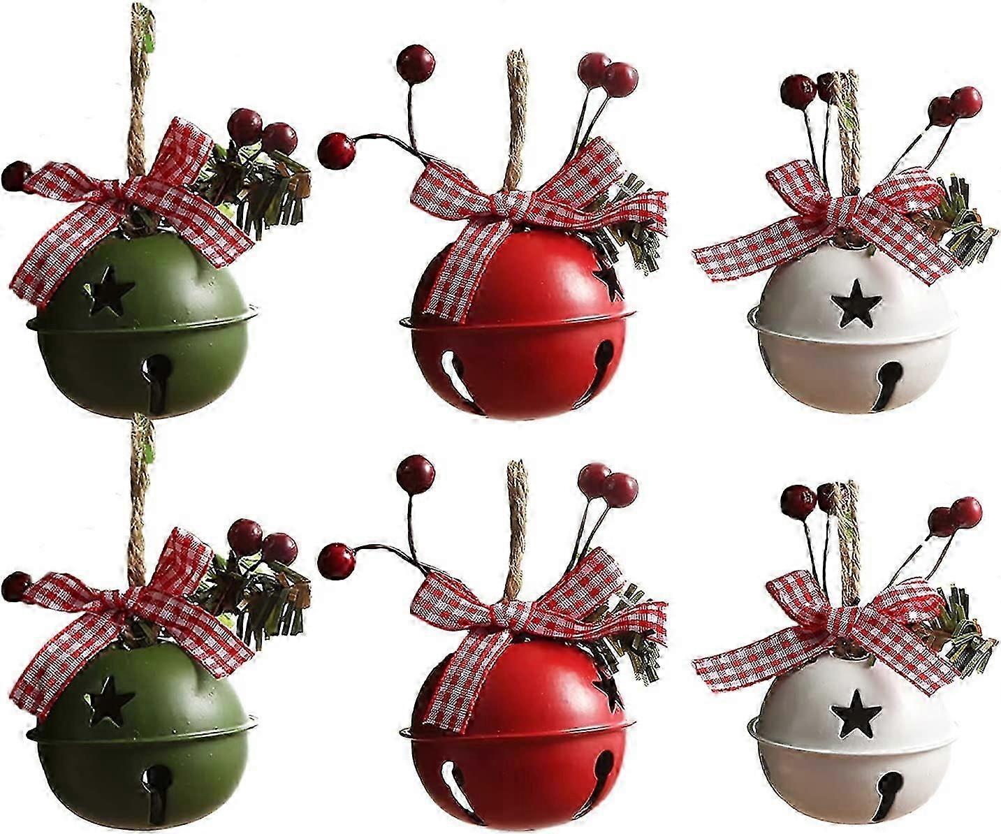 6 Pack Christmas Bells, Large Metal Pendant with Holly Berry Ribbon for Christmas Tree Wreath Decoration