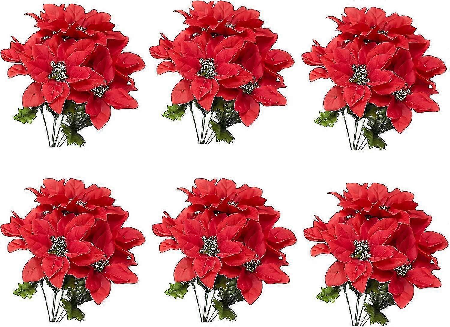 6 Pack Artificial Poinsettia Bushes,13.8 Inch Faux Red 7 Stems Velvet Poinsettia Floral For Indoor Outdoor Heilwiy