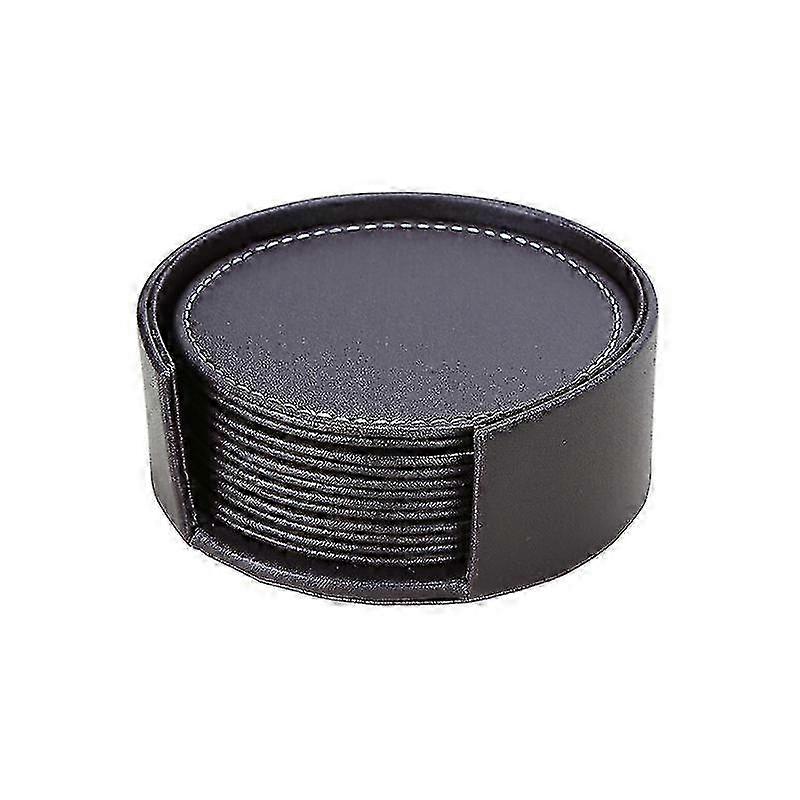 6-Piece Black Round PU Leather Coasters Set with Holder for Coffee Bar Pub