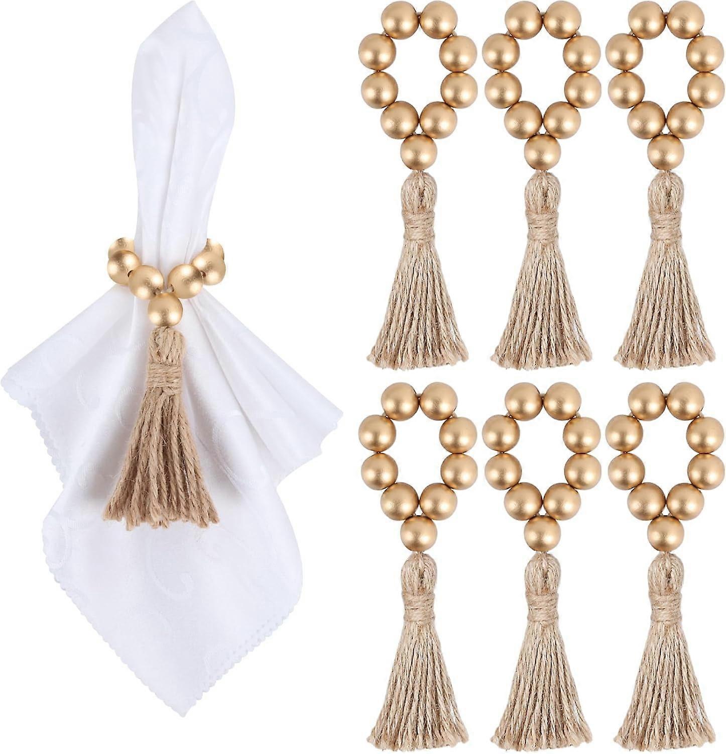 6 Pieces Wooden Bead Napkin Rings, Farmhouse Stretchable Napkin Rings with Tassel Boho Napkin Rings for Dining Table,Wedding Decoration