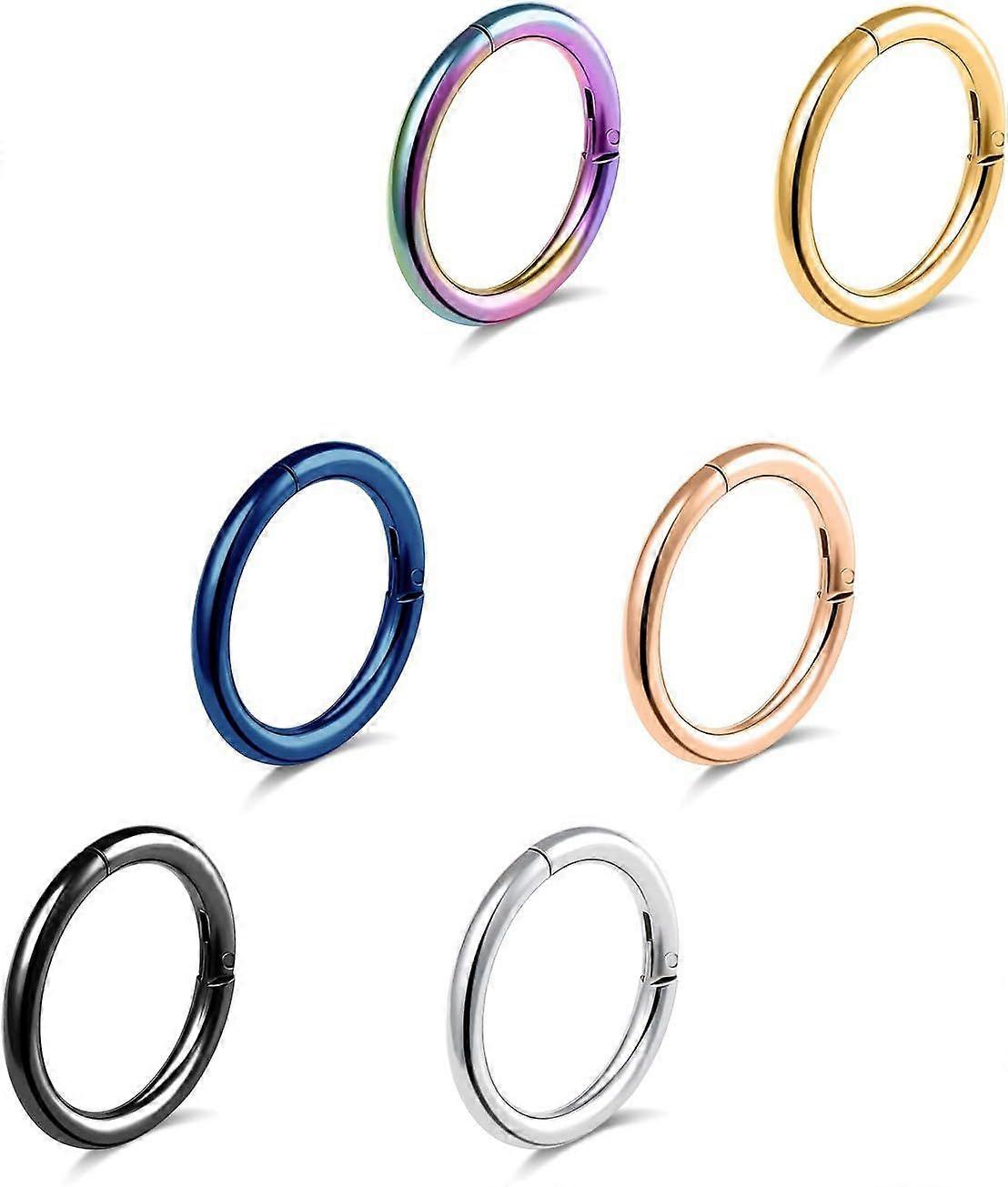 MULTICTIONAL CHOICESVarious Sizes Hoop Ring, Perfect As Clicker Ring, Lip Nose Daith Cartilage Helix Tragus Hoop Piercing, More Choices for Daily Wear HEALTHY SOLID MATERIALMade of Quality Stainless Steel, Rust Resistant, Highly Polished Finishing and Strict Metal Electroplating Craft Create Super Smooth and Shiny Surface, Comfortable to Wear CLASSIC DESIGNSeamless Round Hoop Ring, Simple, Trendy and Easymatching With Your Wardrobe, Flexible Click Closure, Convenient to Open or Close PERFECT SET6 Pieces in One Set, Inner Diameter: 8mm, Gauge Size:14(1.6MM), Multiple Colors Meeting Your Different Needs of Body Piercing, NOTES:Not Recommend as Septum Ring(SMALL) AFTERSERVICE GUARANTEESpeedy Customer Service With Satisfactory and Patient Answer in 24 Hours, 90 Days Unconditionally Exchange or Money Back Warranty