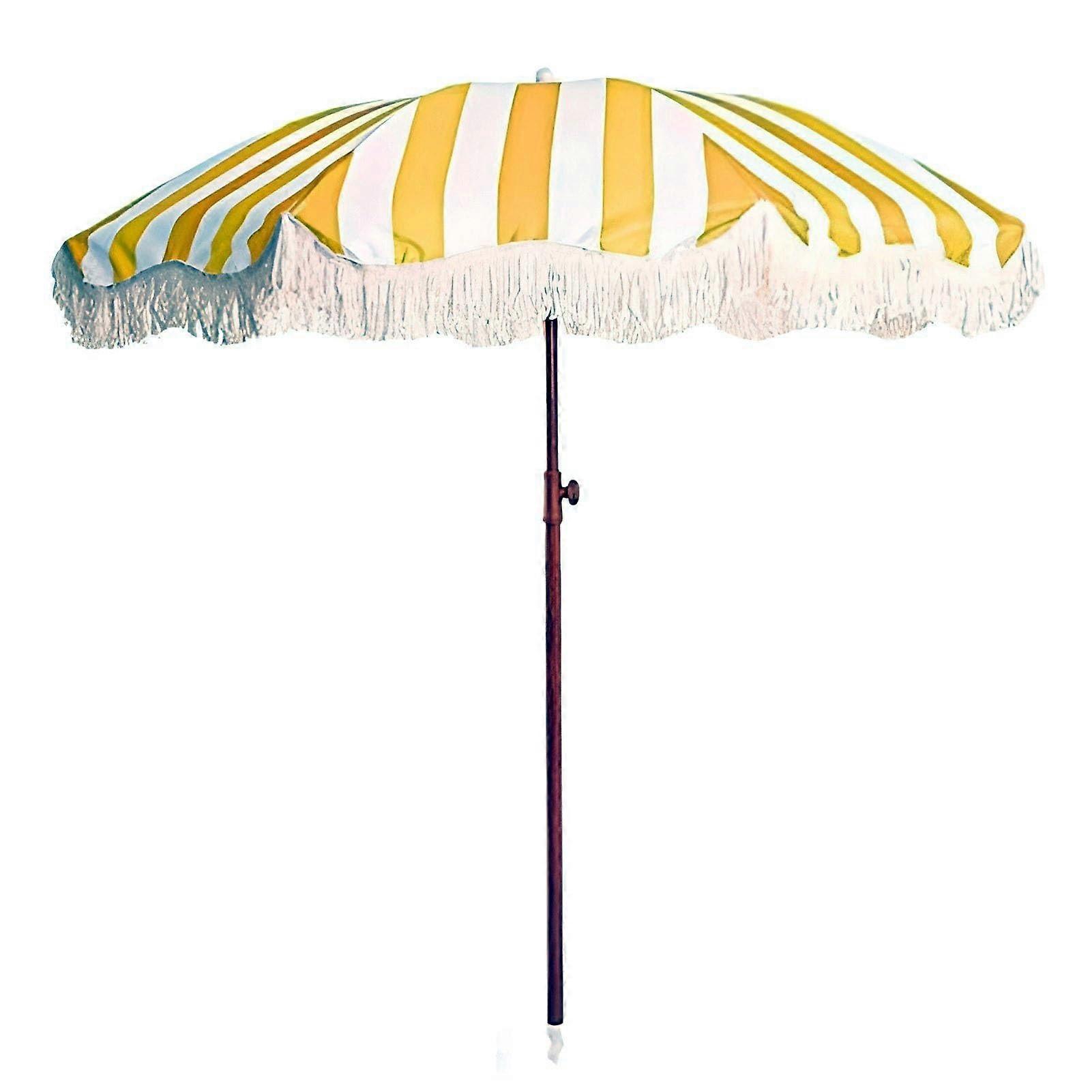 1. Bohemian Style: The parasol is adorned with yellow and white stripes and tassels, full of Bohemian flair, adding vitality and fashion to your outdoor space. 2. 6.5Foot Large, Spacious Parasol: With a diameter of 200 cm (6.5 feet), this parasol provides ample shade, suitable for various outdoor scenes like beaches, gardens, lawns, swimming pools, etc. 3. Portable and Foldable, Easy to Store: Featuring a foldable design, this parasol is easy to carry and store, making it an ideal choice for outdoor trips and holiday gatherings. 4. UV Protection: Made of polyester, this garden parasol offers UV protection, allowing you to enjoy warm outdoor moments safely.