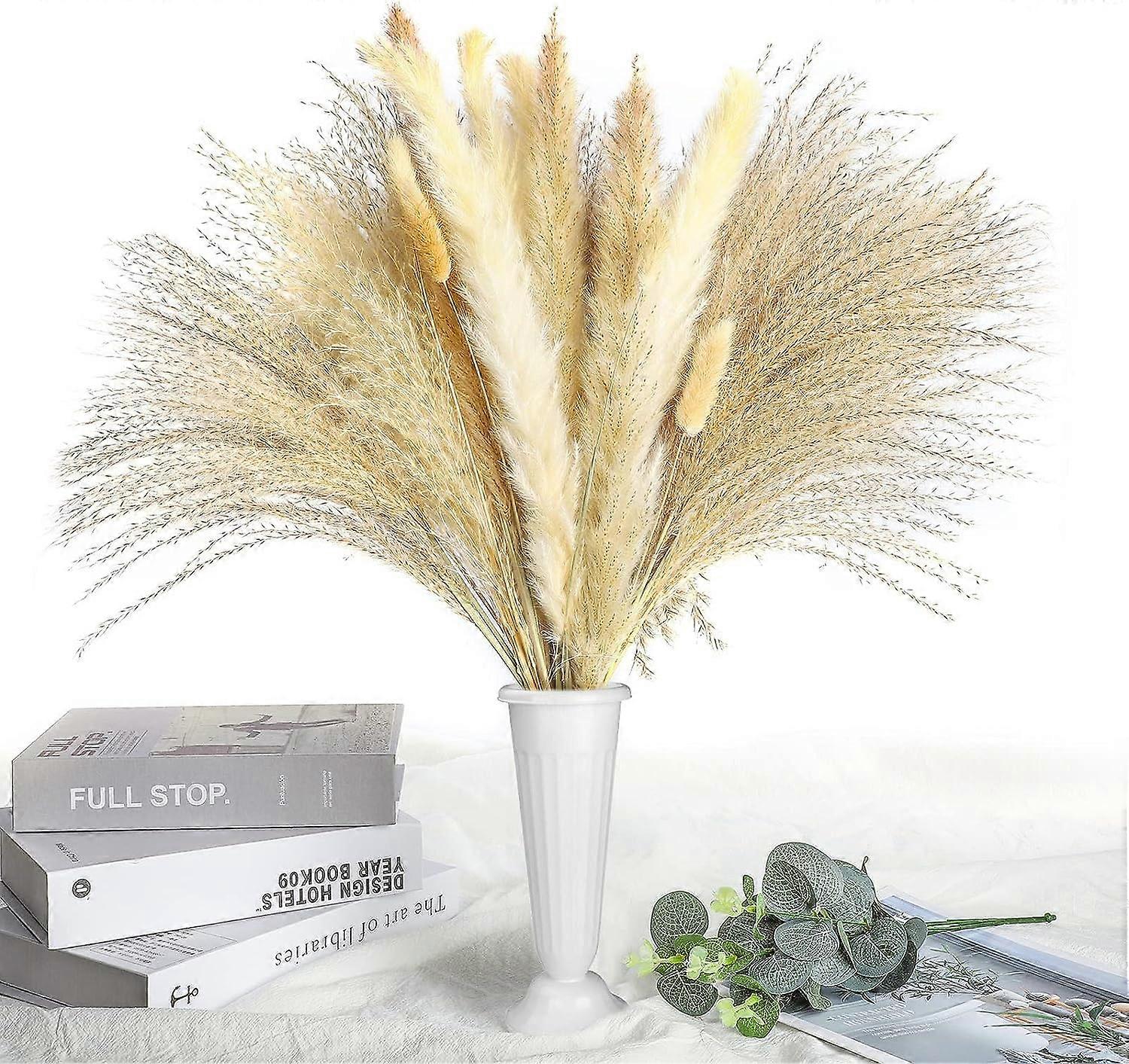 AFFORDABLE SET: Our package has 65 pcs lush pampas plants, including 4pcs brown pampas grass, 4pcs white pampas grass, 47 pcs beige pampas reeds, 8pcs bunny tails dried flowers, 1pc white large reed, 1pc gray large reed. The total height of this dried fake grass is about 43cm/17 inches, the feather part is about 36cm/14 inches, suitable for many styles of vases.