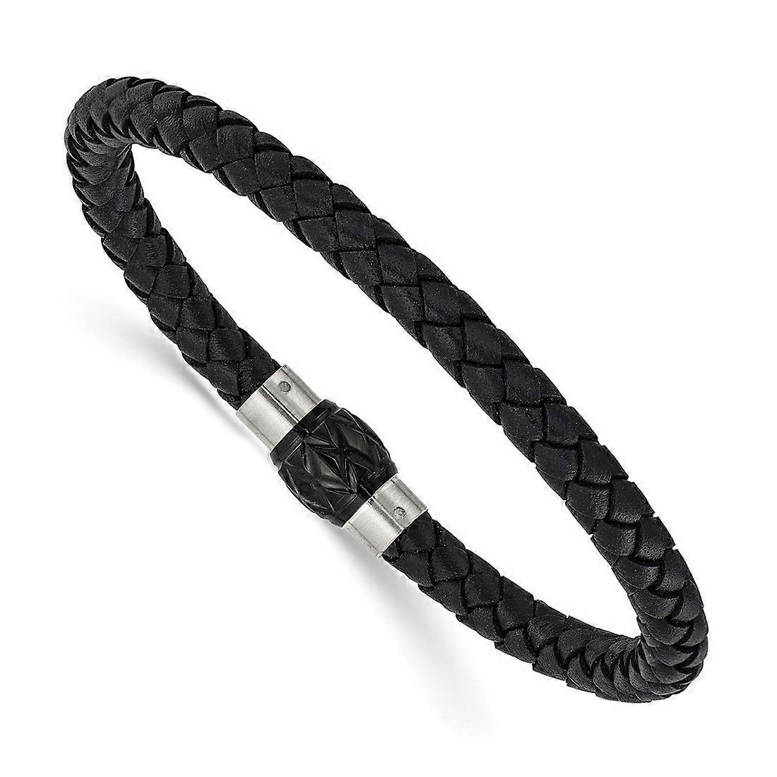 6mm Stainless Steel Brushed and Polished Black Woven Leather Bracelet 8.5 Inch Link-Bracelet for Women