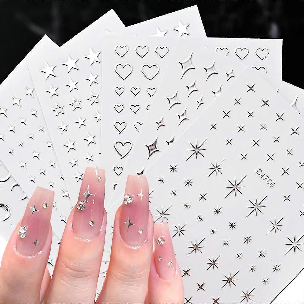 6pcs Star Nail Decals Metallic Silver Star Nail Stickers for Nail Art Luxury Effect Heart Nail Decals