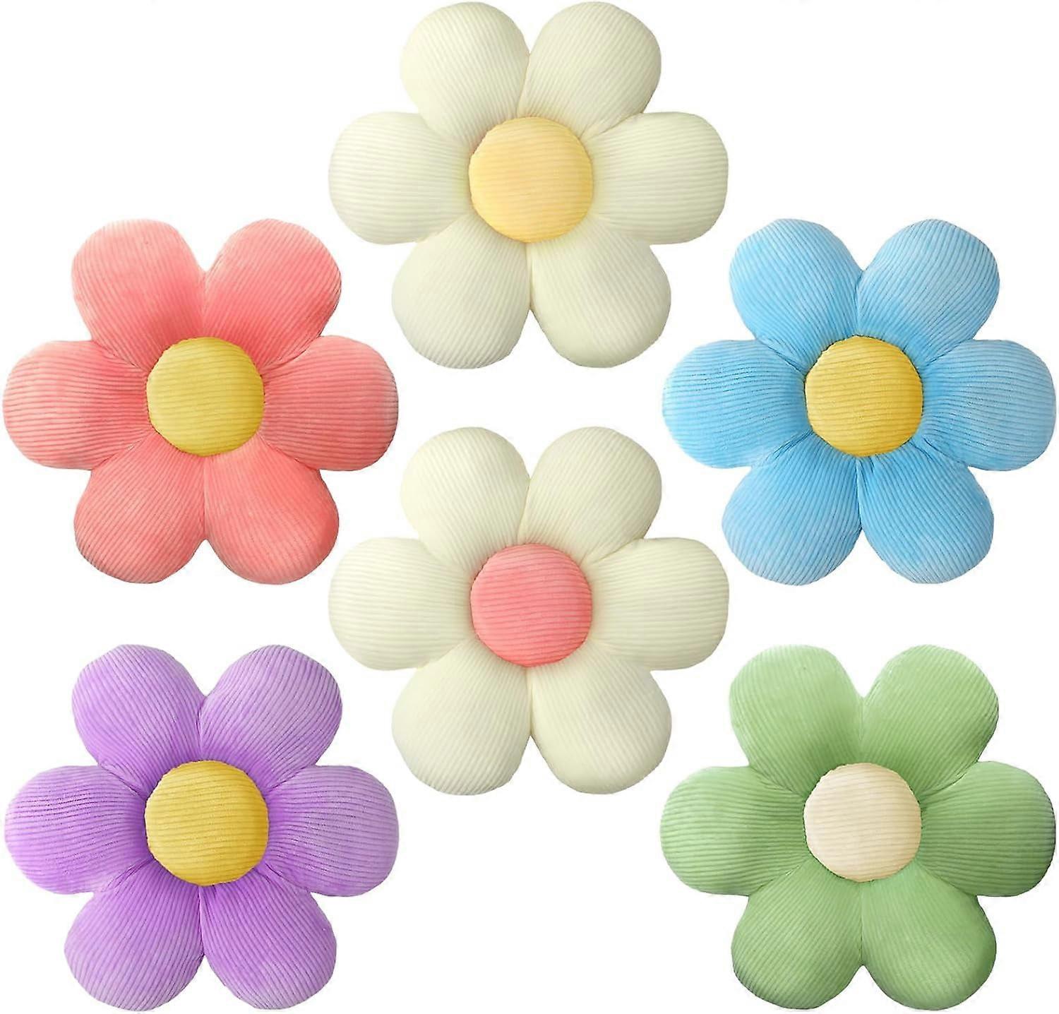 Product Description: Features: Fit for many occasions: You can use the floor seat cushion when inviting friends and family over for an afternoon snack at home, and use them in cozy style to create an elegant setting. It would fit as well if apply them in the kitchen, living room, dining table, bedroom, birthday. Thoughtful gift: The cute flower pillow is equipped with both practicality and beauty, therefore you can choose them as gifts for your close friends, family members, colleagues and neighbors. Specifications: Quantity: 6 Material: short plush and velvet Color: green, blue, pink, purple, white and yellow, white and pink Size: 19.69 inches/ 50 cm Package includes: 1 x Green flower shaped throw pillow 1 x Blue flower shaped throw pillow 1 x Pink flower shaped throw pillow 1 x Purple flower shaped throw pillow 1 x White and yellow flower shaped throw pillow 1 x White and pink flower shaped throw pillow Notes: Manual measurement, please allow slight errors on size. The color may exist a slight difference due to different screen displays. Our product is not suitable for sensitive skin. Test whether there is any allergy on a small part of your skin before use. Please stop applying if there is any discomfort. Suitable Size: you will receive 6 pieces of decorative throw pillows; The size is about 19.69 inches/ 50 cm, which can meet your daily needs; The size is suitable for people to sit as cushions, hold as pillows, and they do not take up too much space when not in use Widely Function: our flower shaped pillows can not only be used as chair cushions, throw pillows and floor pillows, but also can be applied as beautiful decorations at home or in cars, dormitories, bedrooms, living rooms, and offices to help you relieve fatigue when working, reading, and watching TV, and feel comfortable Soft Material: our flower chair cushions are made of short plush and velvet materials, soft and fluffy, tightly stitched, and comfortable to sit for hours on end; Please take them out and let them sit for 3 hours before use to restore the fluffy feel Cute Design: our flower shaped pillow is designed in the shape of cute flowers with 6 petals, making them both adorable and elegant; Moreover, our floor pillows are soft and supportive, so they could maintain their shape well and are ideal for sitting; They can gently wrap your body, allowing your hips and waist to relax Bright Colors: our flower pillow cushion is in vibrant colors, which are full of vigor and attractiveness to enhance your home decoration; You can choose different colors according to your preference and daily mood