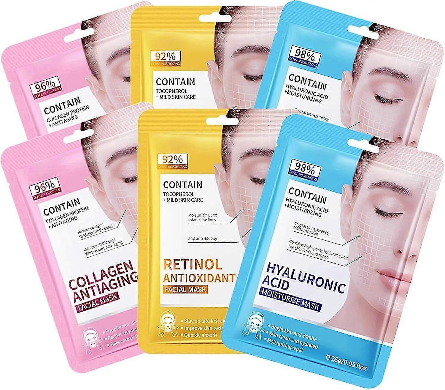 6PCS - Collagen Face Masks Skincare Set - Retinol Sheet Masks Multipack - Hydrating Face Mask - Hyaluronic Acid Sheet Mask Set - Anti-Wrinkle, Anti-Ag