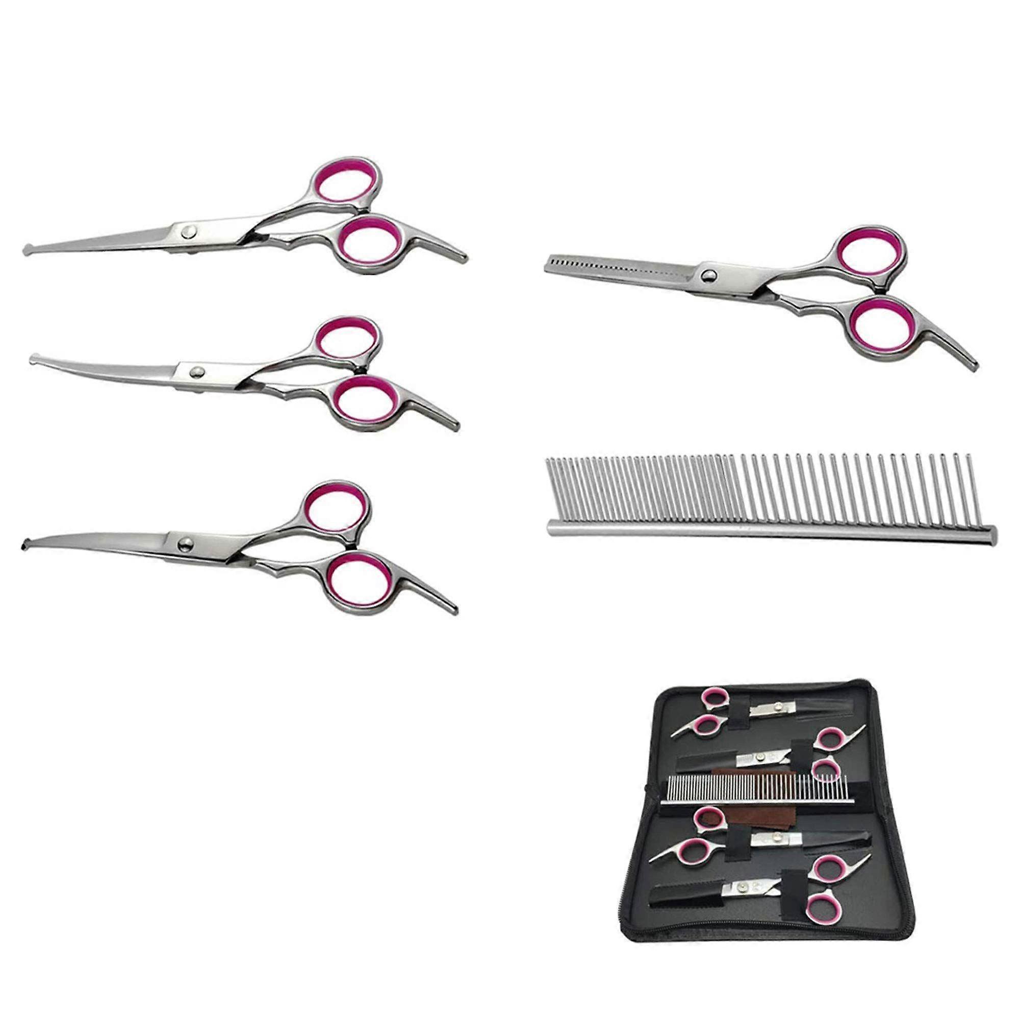 stainess steel for dog grooming scissors, cat grooming scissors, dog trimming scissors for small dogs, pet grooming, dog grooming tools Dog grooming scissors kit, pet grooming trimmer set include thinning, straight, curved shears,comb for curly hair Super Sharp and Durable Dog Scissors for Grooming Professional- The dog grooming scissors is made of stainless steel, every blade is razor sharp and hard without rusting, reducing the friction to shear pet hair breezily, even long haired Easy to Use with Ergonomic Design for Dog Grooming Supplies rubber rings on the handle, to avoid harming hands and prevent slipping, and removable for different finger sizes use. With rubber tip on the finger holes surrounding dog grooming kit handle, there will not quick method noise as the electric clippers to make your dog scared Safety Protection with Rounded Tip Dog Grooming tools for Pet Grooming - dog trimming scissors for small dogs with sasfety Rounded Tip, can provide security protection cut very well when trimming sensitive areas like face, ears, eyes, nose, paw or body without hurting, especially for new home dog groomer Good Quality for dog grooming tools - All grooming scissors for dogs, cats are firm with thinning shears included, steady and very comfortable to hold and use, best gifts for fur baby birthday gifts, Thanksgivng, Christmas and, to make them more beautiful The rounded tip dog grooming supplies scissors kit with zipper closure case, designed for safety and care of grooming implements, has an elastic restraining band and leather scissor point protective sheath for each implement