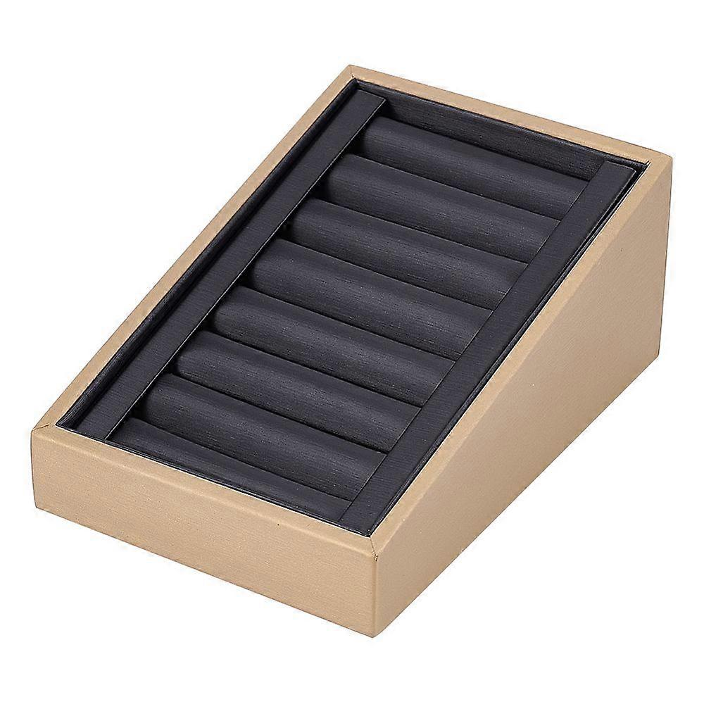 7-Slot Brushed PU Leather Covered Wood Finger Ring Display Trays Jewelry Organizer Showcase Ladder Shape Gold 10.5x15.6x6.5cm