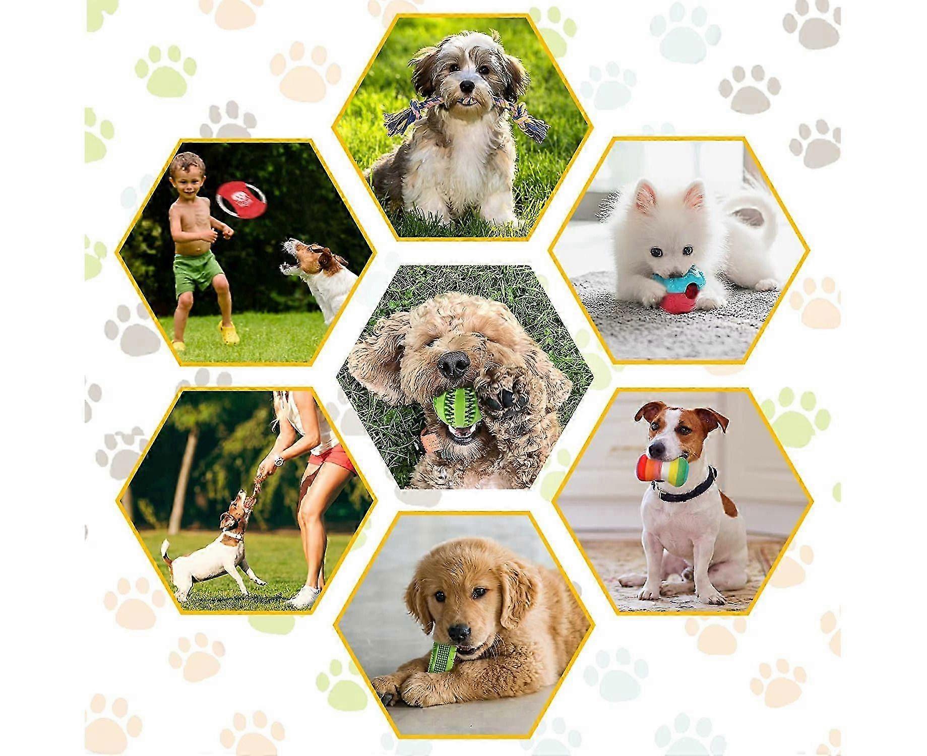 Features and Specifications:**Tips:**The colors for some part of toy are send by random.Great for Dogs & Protect Your Home Dogs are chewers by nature, when teething, boredom, loneliness, stress relief, will chew everything. Our dog chew toys designed for chewing dogs to protect your home (like shoes, sofa, pillows) from chewing. Through these exclusive puppy chew toys not only give you a tidy home and make your dog healthy.Clean teeth & Freshen breath Clean your dog's teeth, make your dog healthier. So by our chewing rubber toothbrush, and rope toys, dogs get gum massage and stress relief, reduce tartar and plaque buildup as your dog chews away and help to freshen breath. Make your puppy having healthy chewing behavior by our dog teething toys.Training toys & Improve relationship Training make dogs physically fit and mentally sharp. Dogs love Chasing a training toy. When dogs learn to toss and roll dog treat balls to get their treats out. And various rope toys are great for tug. These pet toys positively enhance the relationship between you and your dogs.