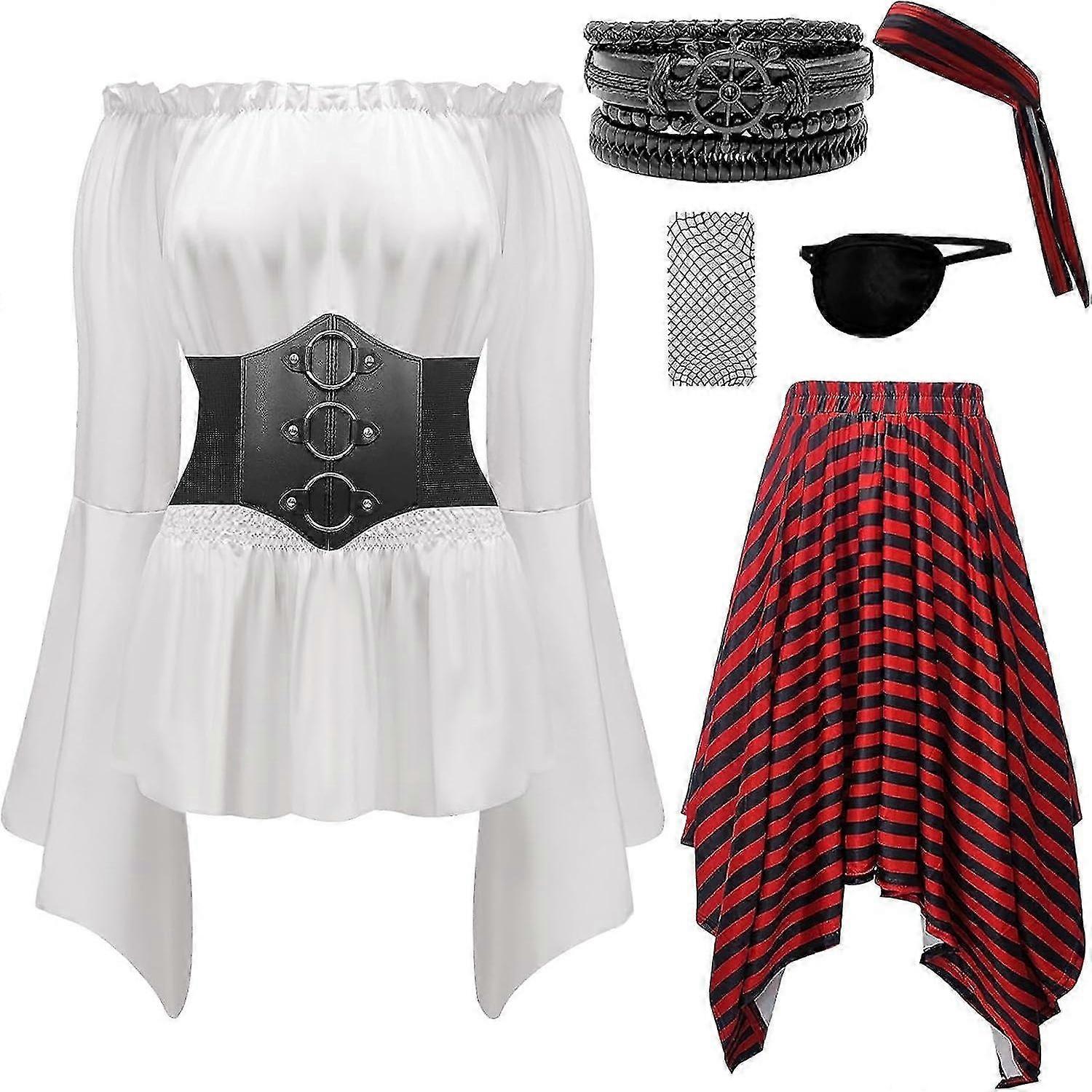 7Pcs Womens Pirate Costume Cosplay Renaissance Blouse Tops Corset Waist Belt Pirate Skirt Pirate Cosplay Outfit