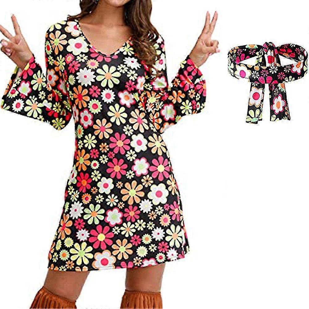 70s 80s Women Hippie Disco Outfit Set Long Sleeve Dress + Headband
