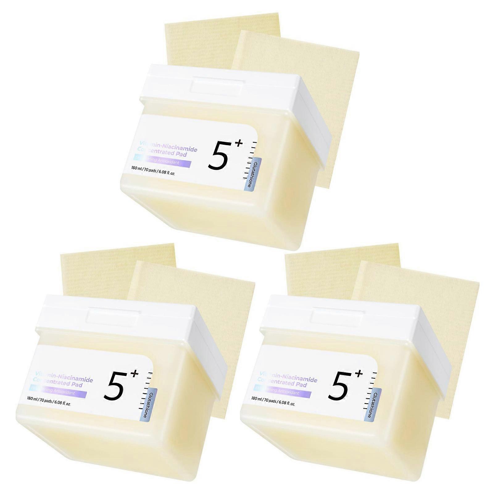 Features: Potent Brightening: Infused with high concentrations of Vitamins C derivatives and Niacinamide, these pads actively work to diminish dullness and promote an incredibly luminous, clear skin tone. Dark Spot & Hyperpigmentation Reduction: Effectively targets and visibly reduces the appearance of existing dark spots, sun spots, and post-acne marks, preventing future discoloration for a more uniform complexion. Pore Minimizing & Refinement: Niacinamide, a star ingredient, helps to visibly tighten and refine enlarged pores, contributing to a smoother and more polished skin texture. Enhanced Skin Barrier Function: Strengthens the skin's natural protective barrier, reducing sensitivity and improving overall resilience against environmental aggressors. Antioxidant Protection: A rich blend of vitamins provides robust antioxidant defense, shielding the skin from free radical damage and promoting youthful vitality. Intenses Hydration & Moisture-Lock: The essence-soaked pads deliver deep, lasting hydration, plumping the skin and locking in-moisture for a supple and dewy feel. Notice: 1.Actual color may be slightly different from the image due to different light effect 2.Please allow 1-3cm deviation due to manual measurement Description Product Specifications: 70 Pads Each Box Ingredients: Water, Glycerin, Carbomer, Triethanolamine, Vitamins C (Ascorbic Acid), Niacinamide, Glutathione Package List: 70/140/210pcs Toner Pads