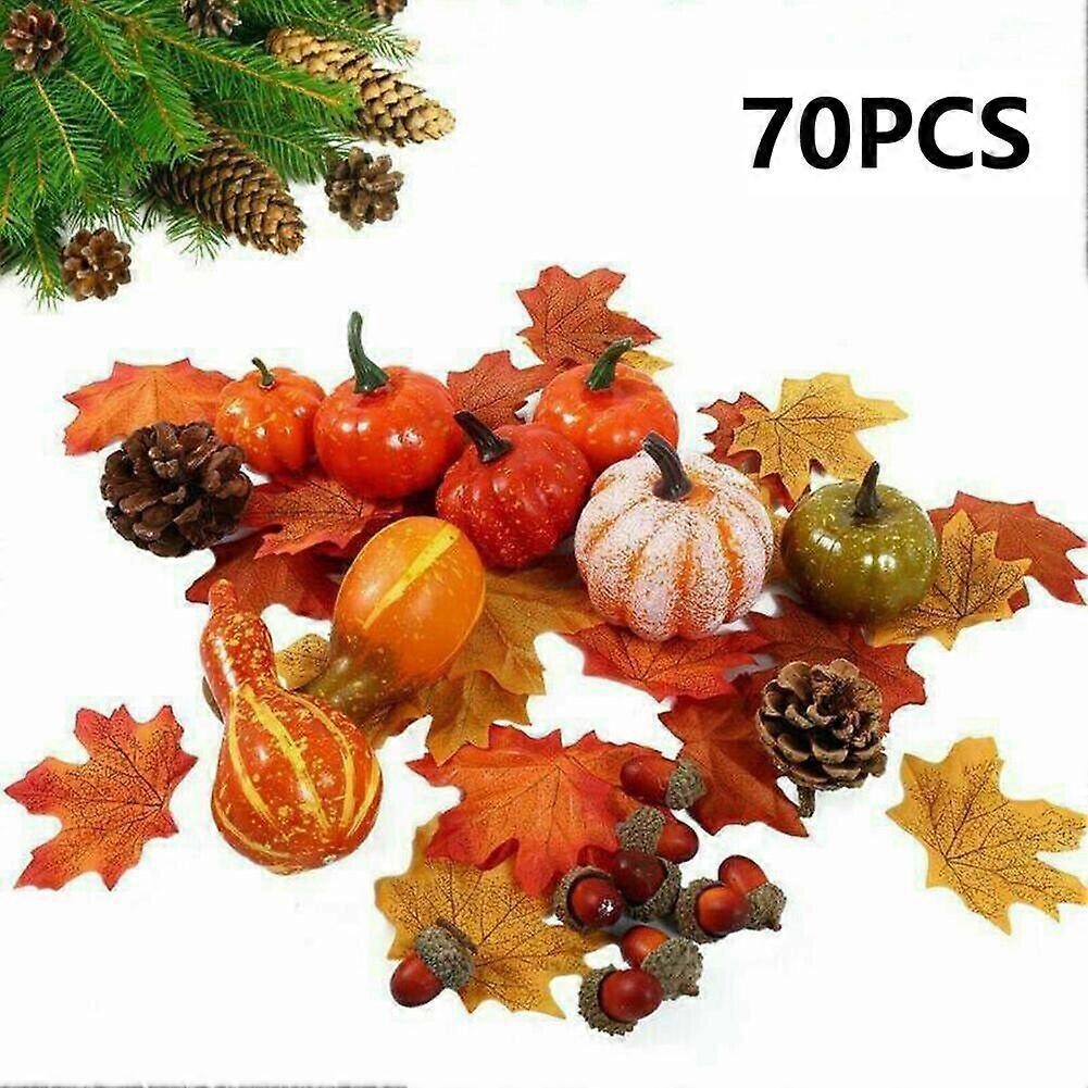 70pcs Halloween Decoration Set, Artificial Maple Leaves, Harvest Pumpkin, Small Acorns, Pine Cones and Gourds for Autumn, Fall and Thanksgiving Home