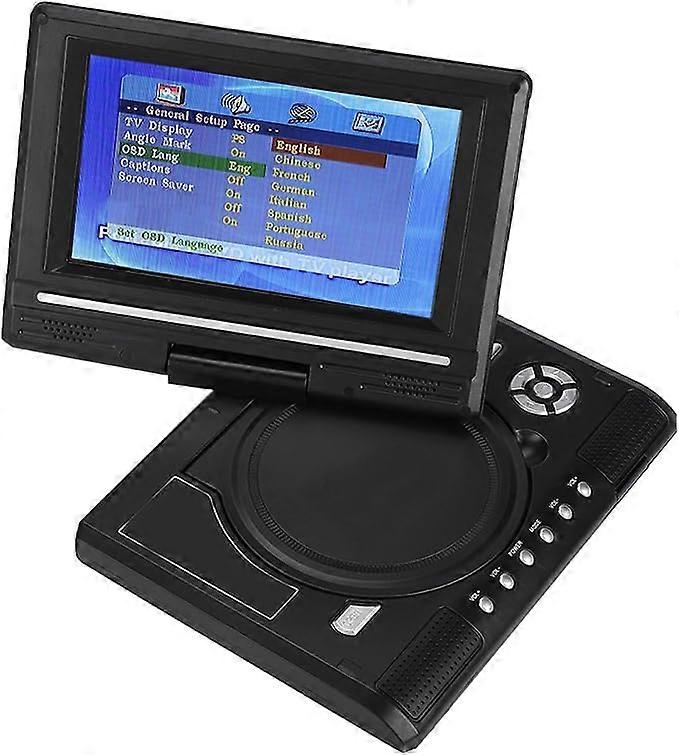 It has a high-speed USB interface and can be connected to a removable hard disk. Built-in card reader, can directly read movies, music, photos and so on stored in Storage / MS / MMC card. Built-in DOLBY and DTS dual decoding function, in the end. Super strong electronic anti-vibration circuit. (DVD 3 seconds, CD/VCD 10 seconds, MP3 90 seconds).Built-in with a large capacity rechargeable lithium battery. It is convenient for outdoor use and can be played continuously for about 2 hours. Fully compatible with AVI EVD DVD, SVCD, VCD, CD, CD-R/RW, and MPEG-4 formats and JPG image formats. Full area DVD (disc is not limited by area ). Support game function7-inch high-definition LCD display 16:9 widescreen, 270-degree rotation, suitable for a variety of playback environments. TV function. With cable TV signal interface, it can preset hundreds of channels, which can easily receive wired and wireless TV signals (wireless viewing depends on local signal strength).AV output & AV input function: You can connect this unit to the TV to watch DVD movies; you can also connect the to the advanced to enjoy the shock effect of the music. AV input can be connected to external video, such as camera or ordinary DVD. Built-in 3D sound processing Support FM radio function, The machine has a disc age control settingIntelligent power-off memory function, when you watch a blockbuster or serial drama, when something goes away to turn off the power or suddenly power off, when you turn it on again, the machine will intelligently remember the one that was playing when the power was last turned off. The time period of the disc content continues to play, eliminating the need for manual search troubles.Specification:Condition: 100% Brand NewMaterial: ABSColor: BlackSize: Approx. 21 * 16.5 * 4.5 cm / 8.2 * 6.4 * 1.7 inchBattery: 2 * AAA (NOT INCLUDED)Resolution: 800*480Screen Size: Approx. 7 inchesAspect Ratio: 16:9 widescreenLanguage: English / French / Spanish / Chinese / Japanese / Korean / Russian / ThaiBattery Capacity: 1500mahPlay Time: Approx. 60 minutesRemote Control Battery: 2*AAA BatteryWeight: Approx. 1086 g Package List:1 * Portable DVD Player 1 * Charger1 * Remote Control1 * AV Cable1 * Gamepad1 * Game Disc1 * Car ChargerNote:1.Please allow 1-3 cm error due to manual measurement. Thanks for your understanding.2.Monitors are not calibrated same, item color displayed in photos may be showing slightly different from the real object. Please take the real one as standard.3. Please note that the new type and old type of this product will be sent randomly, and make sure you will not mind before ordering.