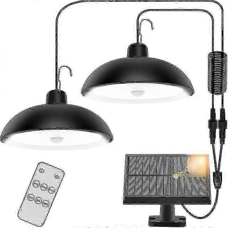 Upgrade Double Head LampThe upgraded solar chandelier is equipped with 2 independent lights, a solar panel and a remote control. You can use the remote control to turn on or off 2 solar lights individually or together, adjust the brightness (25 percent or 50 percent or 100 percent ) and set different lighting modes. (Note: the remote control should point to the lamp head, the effective range of the remote control: 3-5m). Advanced Motion SensorThe outdoor solar light has 4 light modes : 1.) Sensor Mode: Lights up when motion is detected. 2.) Penumbra and Sensor: Dim light (20 percent ) changes to strong light (100 percent ) when motion is detected. 3.) Light sensor: The solar light is automatically charged during the day and automatically turns on at night. 4.) Always-on mode: The light is always on regardless of day or night. Energy-saving Solar Pendant LightThe solar panel is made of polysilicon and the conversion rate reaches 20.5 percent . 78 super bright LED lamp beads and 4800mAh high capacity battery ensure better lighting and longer life. The solar panels can be adjusted 360 to ensure that enough light can be absorbed from sunrise to sunset. Charging time: 6-8h lighting time: 8-16h. Split Design, Waterproof and Durable The solar panel and the lamp body are designed separately. The classic design solar lights are paired with a black retro metal shade, which is both practical and decorative. One solar panel can power two lights, saving you more energy IP65 waterproof and high quality ABS materials ensure that the solar pendant light can withstand various extreme weather conditions. Easy Installation, Widely UsedThe solar lamp and the solar panel are connected by a cable of 3m (9.84ft) waterproof extension, easy to disassemble and install. Without additional wiring, using a screwdriver, you can quickly install solar panels in direct sunlight and hang lights in gardens, patios, yards, sheds, chicken coops, barns, hallways, balconies, bedrooms, etc. Indoor and outdoor scenes.