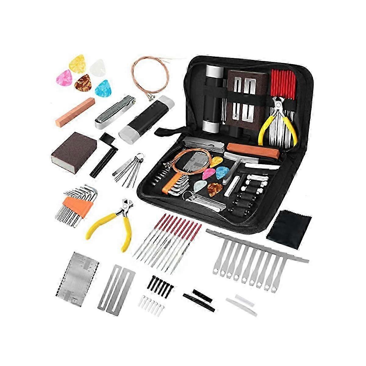 : Guitar repairing tool kit are the most complete kit on the market for daily use, including bridge pins, fret crowning luthier files, guitar picks, guitar strings, bridge nuts saddles, string spreader, string action ruler, grinding stone, guitar fretboard sticker, a storage bag, etc. Muti-function: Guitar setup kit is intended for maintaining and keeping your instrument in well performance, can be applied to change string, set tone, adjust action, check string height, etc., and suitable for string instrument cleaning, maintaining and repairing. Unique Astorage Bag: Assortment of necessary guitar tools are in one bag. We not only provide a package, we also provide each accessory with a small individual package. You can protect and store these tools well to prevent loss and mess. Saving Money & Hassle: The guitar tools kit can the hassle of taking your guitar to a shop multiple times a year. The basic setup of a guitar is a fairly easy process, especially with electric guitars, and beyond restringing, it's a valuable skill that every guitar player should learn as it'll a bunch of time and money. Great Gift Choice: This guitar tool kit is easy to carry and stock. A great gift option for beginners, tuners, musicians, stringed instrument users, and guitar lovers. Material: Stainless steel + ABS colour: As shown Package Contents: 12 x Bridge Pins 8 x Wrenches 2 x Fretboard Fret Protector Guard 9 x Understring Radius Gauges 10 x Fret Crowning Luthier Files 5 x Guitar Picks 6 x Guitar Strings 2 x Bridge Nuts 2 x Bridge Saddles 1 x 13 Different Size Needle File 1 x String Spreader 1 x String Cutting Pliers 1 x String Winder 1 x Feeler Gauge 1 x Grinding Sponge 1 x String Action Ruler 1 x Grinding Stone 1 x Guitar Fretboard Sticker 1 x Wiping Cloth 1 x Storage Bag Only the above package content, other products are not included. Note: Light reflection and different displays may cause the color of the item in the picture a little different from the real thing. The measurement allowed error is +/- 1-3cm.