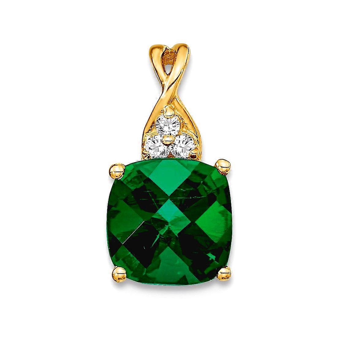 7mm 14k Solid Yellow Gold Checkerboard Created Emerald and Diamond Pendant Necklace-Pendant for Women