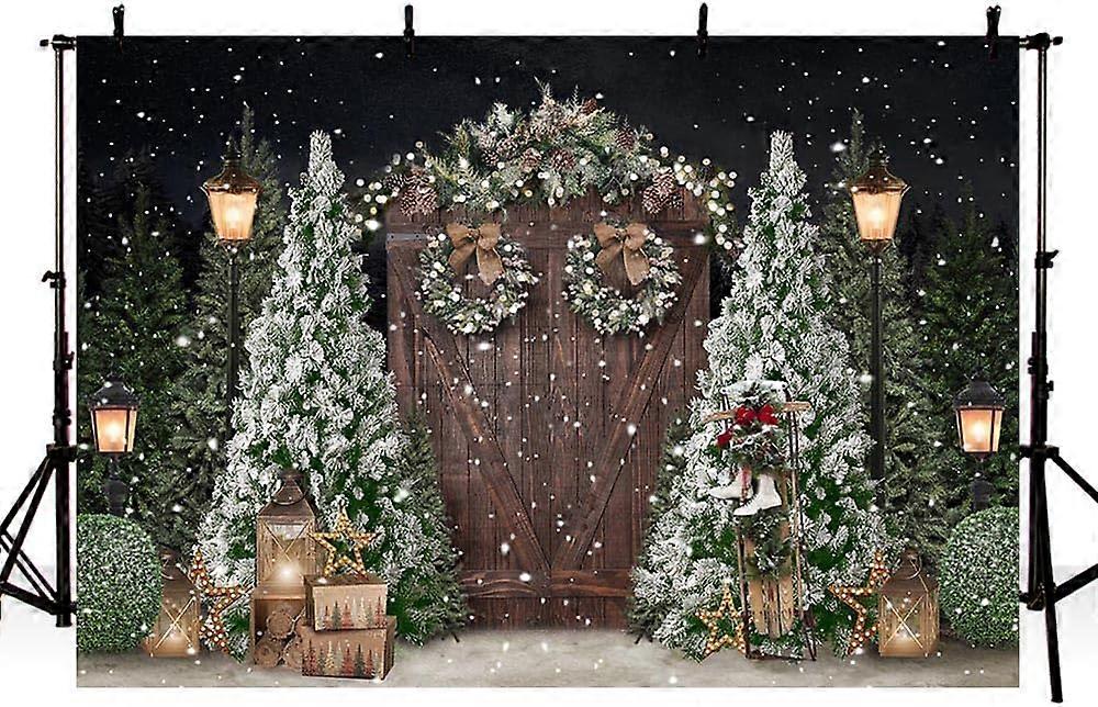 7x5ft Christmas Backdrop Winter Christmas Tree Gift Holiday Snow Scene Photography Background Wood Door Christmas wreath Table