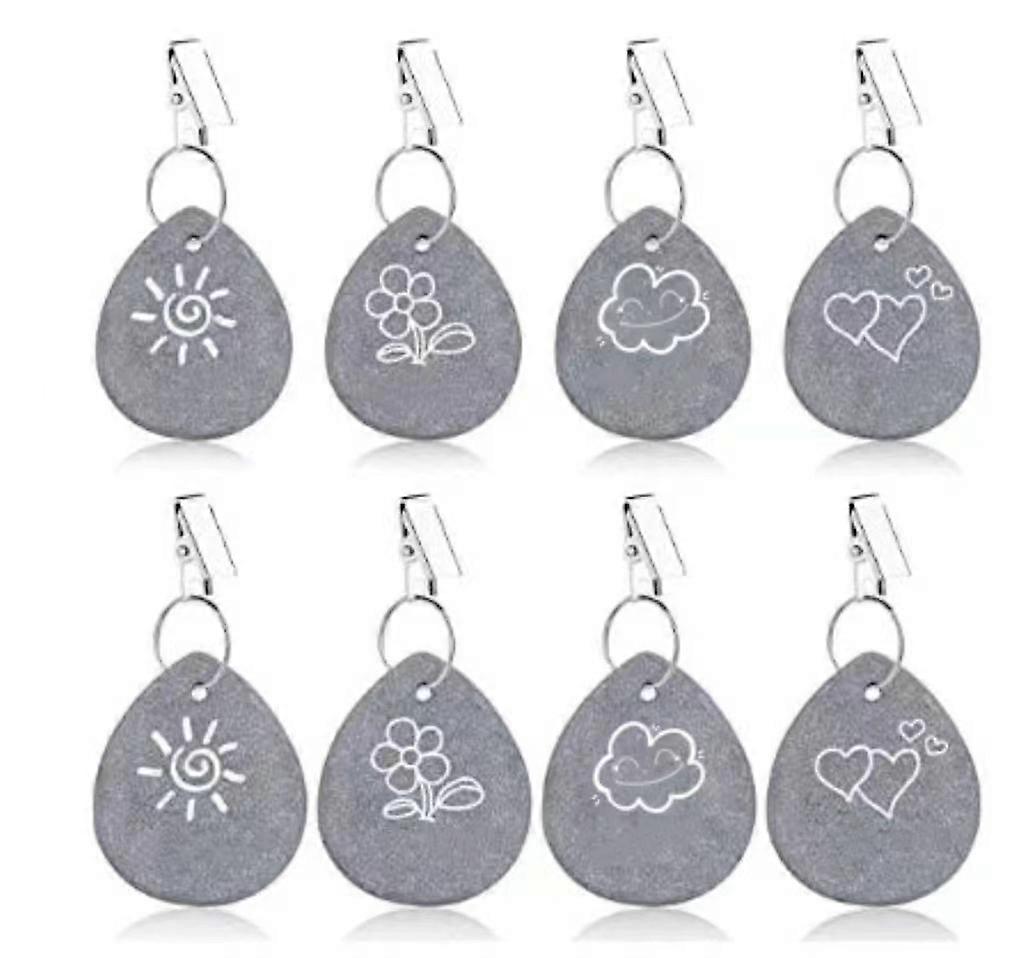 Durable material: outdoor tablecloth weight is made of elegant natural marble, with a simple and nice design, smooth surface and hard texture, which will have a long service life.Strong handle: tablecloth holder is made of high-quality stainless steel, waterproof and rust-proof. The clamp has a strong bite force and can grip the tablecloth firmly to prevent it from falling off due to the weight, do not worry about the tablecloth flying away.Easy to carry and use: weighted tablecloth outdoor holder comes with metal clips, small size, will not take up too much space, easy to carry and use, simply clip it to the edge of the tablecloth to prevent it from being blown away by the wind.Cute design: tablecloth weights are made of marble and metal clips, the tablecloth weights have 4 sewing patterns (love, flower, smiley, sun), this tablecloth weights extra heavy add an elegant and beautiful charm to your tablecloth.Information on size and quantity: you will receive a total of 8 tablecloth weights extra heavy with 8 metal clips, the tablecloth clips weighs approx. 4 x 3.5 x 1 cm, each tablecloth pendant weight is about 30 g, enough quantities for you to meet your daily needs or replacement.Suitable occasion: outdoor tablecloth holders for picnic tables can be used in a variety of places, you can use them to decorate your table at a party, family reunion, weddings or dinner parties, also suitable for outdoor picnics and other occasionsFeatures:--Tablecloth weight made of natural marble and high-quality metal, moisture and rust resistant, can be used both indoors and outdoors.--The small tablecloth weights heavy brings a great ambience to life, is easy to install and remove, suitable for all types of fabrics and does not fall off easily.--These tablecloth weights can fix the tablecloth well, avoid shaking the tablecloth and the influence of the wind, eating with family or friends.--Beautiful and practical tablecloth weights are suitable for indoor and outdoor use, such as parties, home decoration, picnics, gardens, etc.Specification:Material: marble, metal.Colour: grey.Individual weight: 30 - 35 g each.Size: 4.5 x 3.5 x 1 cm. The height with clip is 8 cm.Package includes:8 x tablecloth weights natural stone with clip.Note:1. Due to the difference between screen and monitor, the actual colour may vary slightly from the picture.2. The actual size is measured manually and there may be an error of 1-5 mm.3. As marble is naturally formed, there may be cracks, this is inevitable, please understand.
