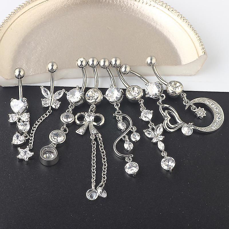 8 Pieces Steel Navel Rings Long Dangle Belly Button Ring Cz Body Piercing Jewelry (silver)