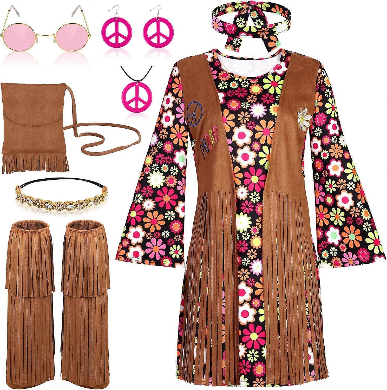 8 Piece 70s Women Hippie Costume Peace Sign Earring Necklace Headband Dress Leg Sleeves Tassel Bag for Halloween Disco