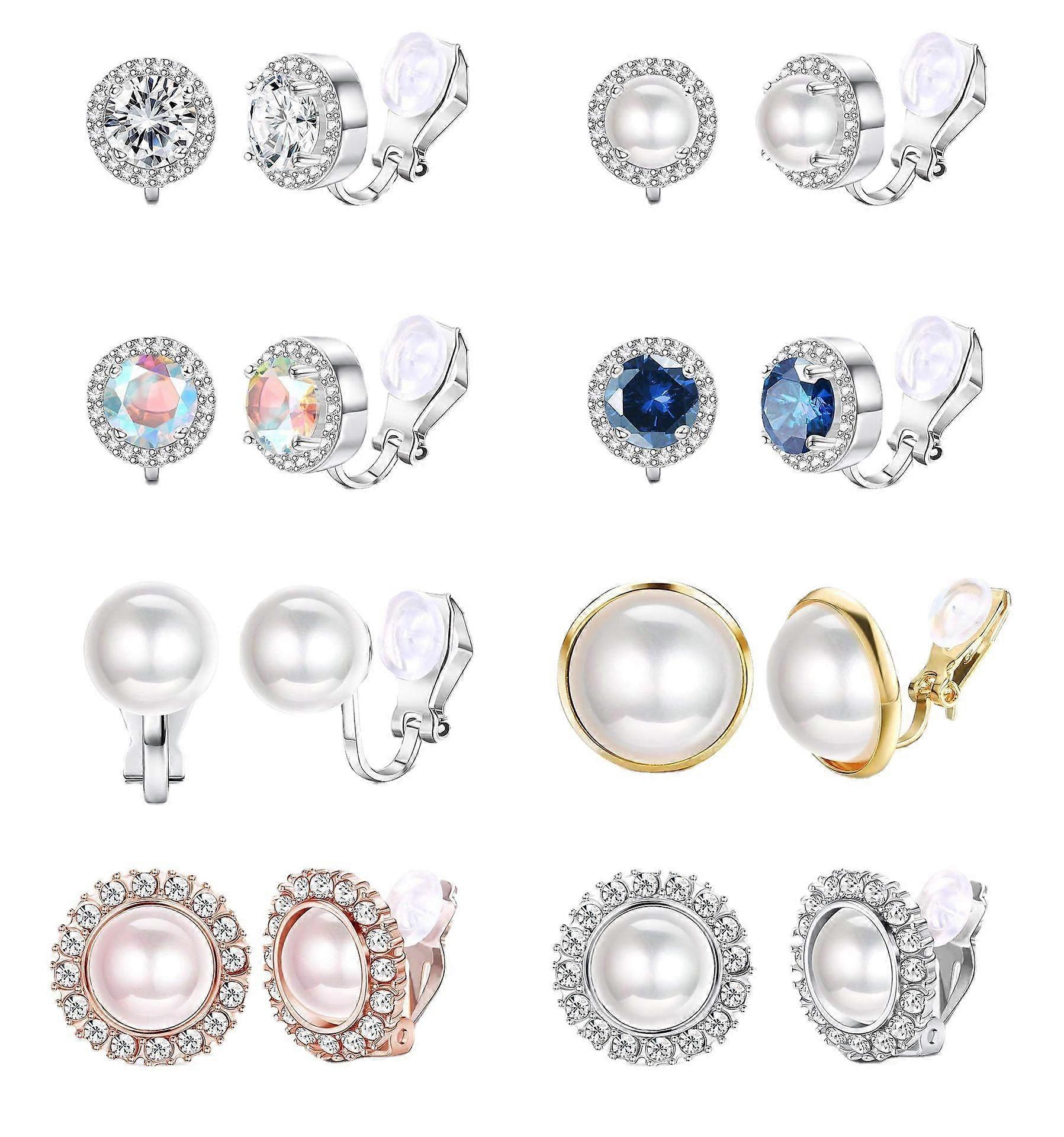 8 Pairs Clip Earrings Set for Women Rose Flower CZ Simulated Pearl Gold Knot Clip Earrings with Rubber Pads Non Pierced Hypoallergenic Clip on Earring