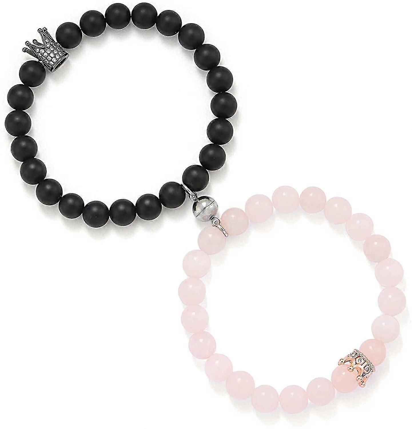 8mm Natural Stone Cz Micro Pave Crown King Queen Beads His And Hers Couple Bracelet, 7.5"