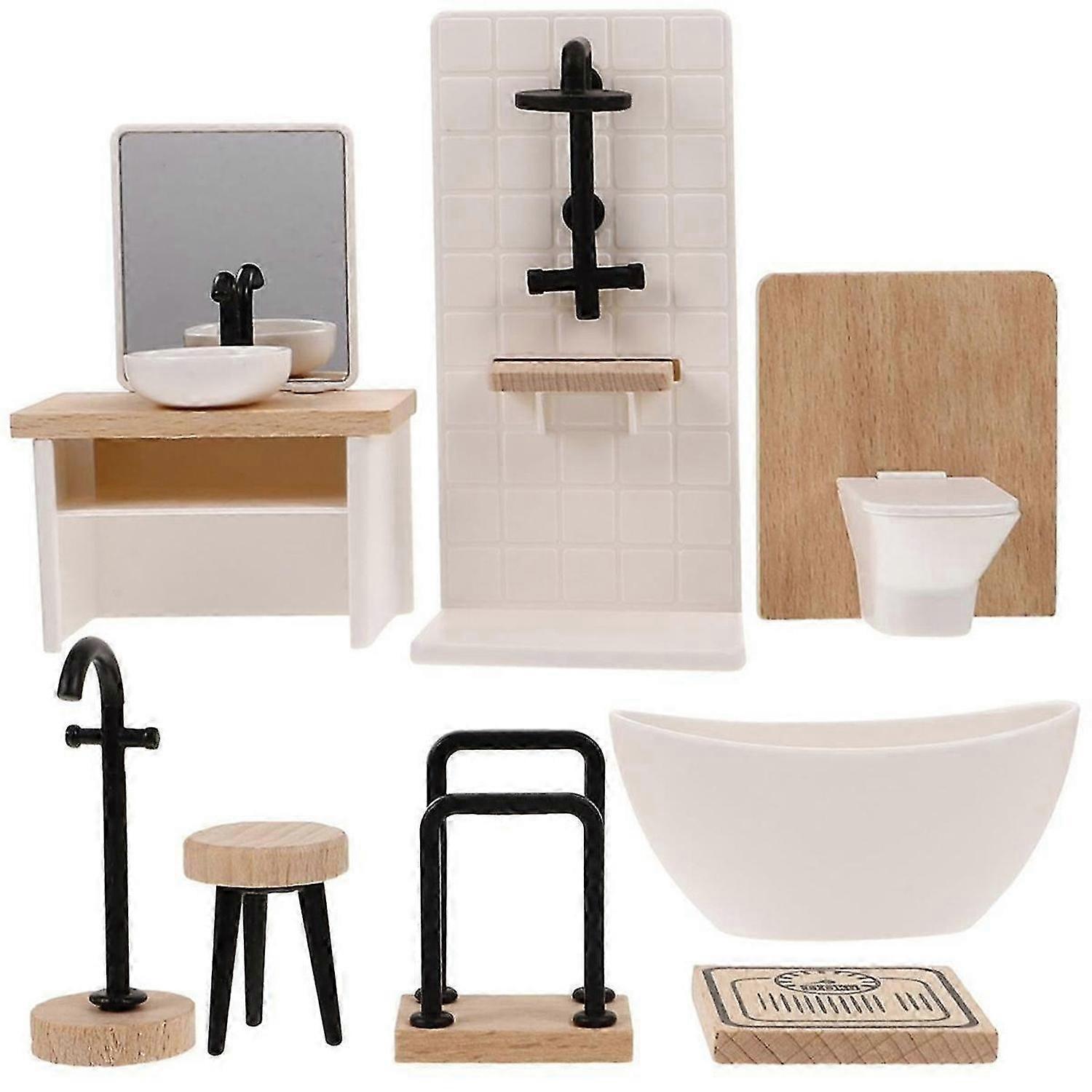 8pcs Bathroom Toilet Bathtub Basin Wooden Bathroom Cabinet with Sink Miniature Furniture for Doll