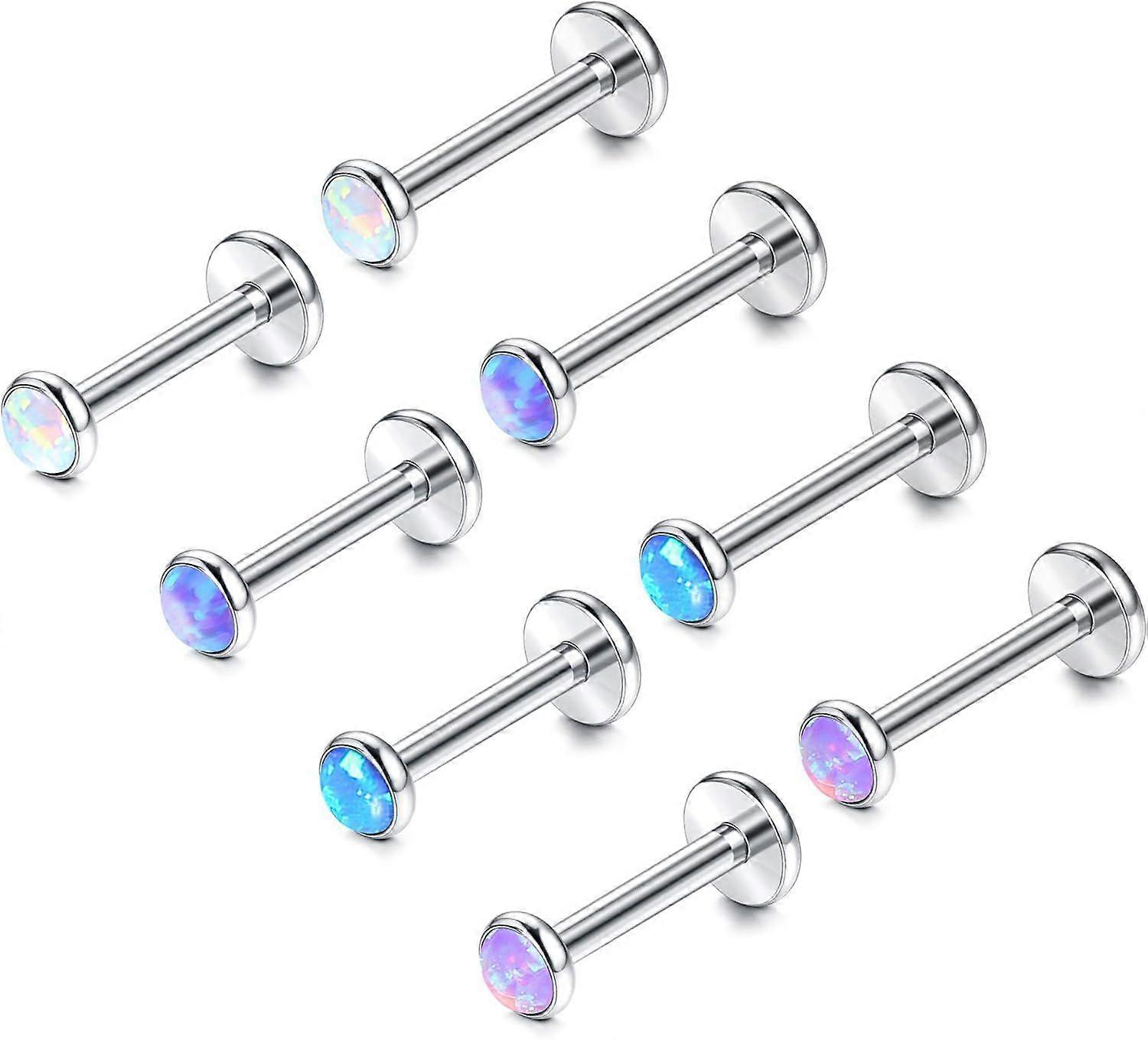 Specificatins: Gauge Size: 16G(1.2mm), Opal Size: 3mm, Bar Length: 1/4" (6mm) & 5/16" (8mm), Four Colors, Flat Back Stud Design, Internally Threaded, Firmly Screw On And No Worry Of Losing, Convenient To Put On And Take Off Opal Piercing Studs Set: Comes With 8 Pcs Opal Nose Rings: 4 Different Colors & 2 Different Bar Length Opal Nose Ring Studs, Each Opal Has Its Own Unique Texture And Luster From Different Angles, Eyecatching And Trendy, More Choices For Daily Wear Multifunction Use: These Conch Piercing Jewelry Are Versatile And Perfect For Nose, Labret, Lip, Tragus, Lobe, Helix, Nostril, Cartilage Conch, Monroe And Other Body Positions You Like. Also Delicate Gifts For Friends, Families Or Yourselves Premium Quality: These Opal Piercing Jewelry Are Made Of Solid Stainless Steel, Rust Resistant, Highly Polished Finishing And Strict Metal Electroplating Craft Create Super Smooth And Shiny Surface, Durable And Hypoallergenic, Comfortable To Wear Customer Service: We Offer a 180Day After Sales Service. Any Problems About Opal Nose Rings, Feel Free To Contact Us, We Will Solve Your Problem ASAP