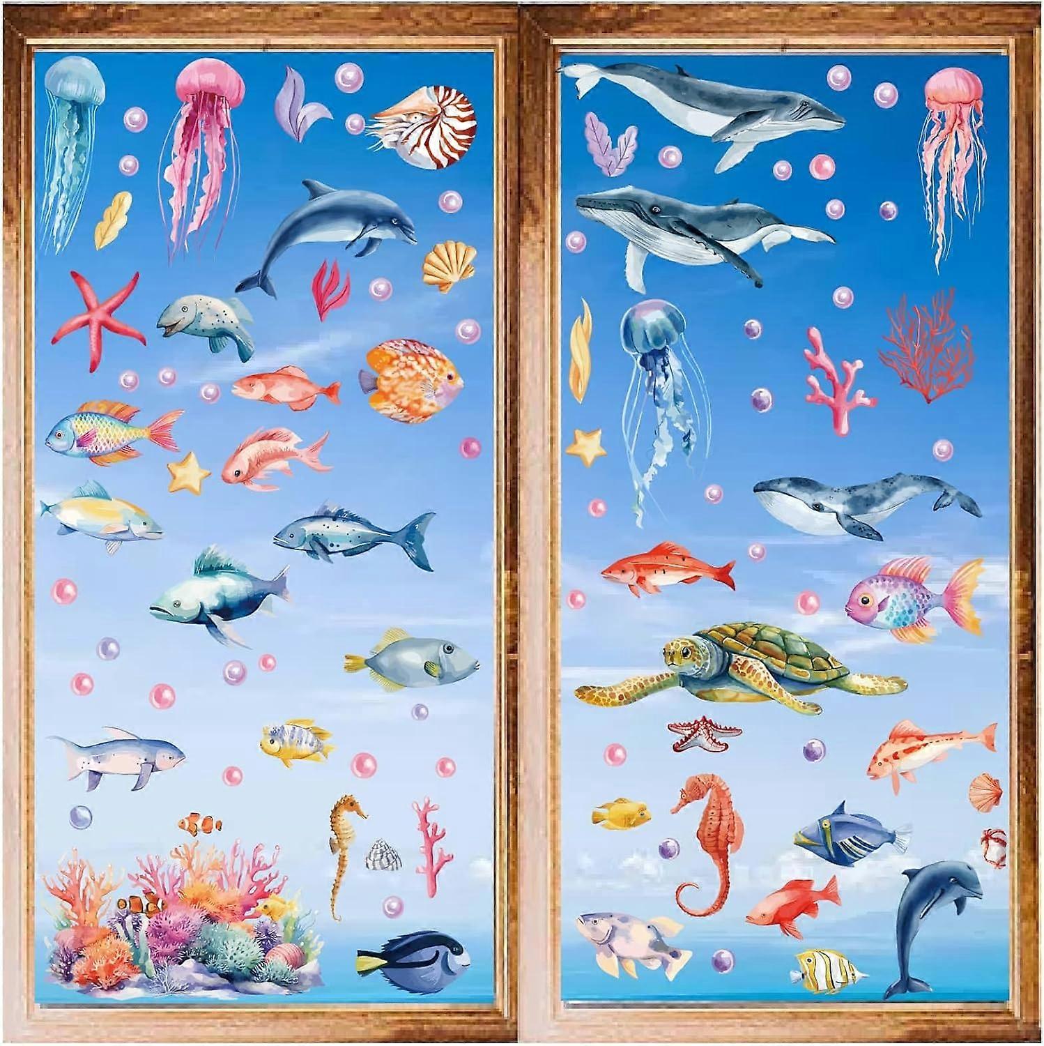 8 Sheets Sea Ocean Window Decals Stickers Jellyfish Shell Coral Whale Cartoon Wall Clings Peel and Stick Vinyl PVC Waterproof Adhesive Decor for Bedro