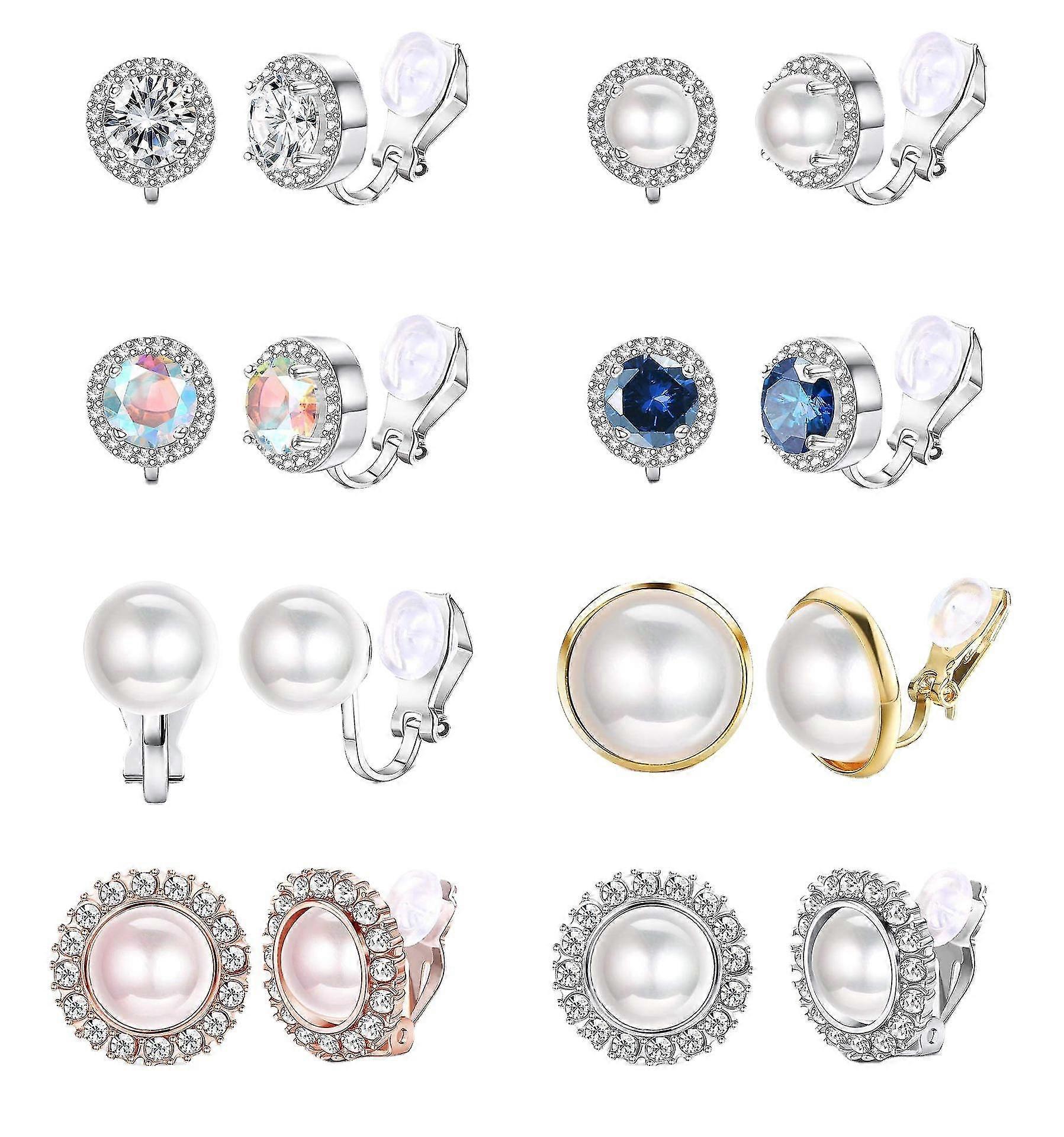 8 Pairs Clip Earrings Set For Women Rose Flower Cz Simulated Pearl Gold Knot Clip Earrings With Rubber Pads Non Pierced Hypoallergenic Clip On Earring