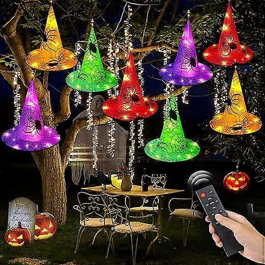 MUST-HAVE FOR HALLOWEEN: Best Halloween decoration for indoor and outdoor, add special hook design, can be hung anywhere. Perfect holiday lights for rooms, walls, windows, walkways, front yards, patios, lawns, gardens and more. Fully blown light show, perfect Halloween party decoration, Halloween tree decoration. So bright and festive, great string lights addition for Halloween lovers.Unique Matching Hat String Lights: 2023 new version of 8 Halloween string lights, novel witch hat design (2 purple, 2 orange, 2 green, 2 red). The total length of the light cord is 33.3 feet (approximately 10 meters), and the height of the hat is 13.3 inches (approximately 33.8 cm). Easy to install, plug and unplug the power adapter directly. Power plug-in for long-lasting use and energy saving. Add a decorative theme to your holidays!8 Lighting Modes to Meet Your Different Needs: Special Halloween Lights, 8 different lighting modes, Combination, Wave, Sequential, Slo-Glo, Chase/Flash, Slow Fade, Flash/Flash and Steady On. IP65 waterproof LED light, various options to meet your needs, change your favorite mode at night with the push of a button. Light up all night long and get squeals from trick-or-treaters.DIY YOUR HALLOWEEN: Spooky witch hat, Halloween outdoor lights, perfect for home DIY house, adding more scary atmosphere. Give your kids and friends a big surprise. Unlike traditional string lights, decorative Halloween lights create a unique witch themed Halloween display. Pairs well with other Halloween themed decorations as an ideal mood creator. Halloween is a big hit!Light Up Halloween Decoration: String Halloween lights, perfect for Halloween party decorations, indoor and outdoor string light decorations, Halloween displays, carnivals, celebrations, club light decorations, costume parties and shows. Decorating fantasies come to life with fantastic lighting, the easiest way to decorate! Why not decorate for the holidays at home?