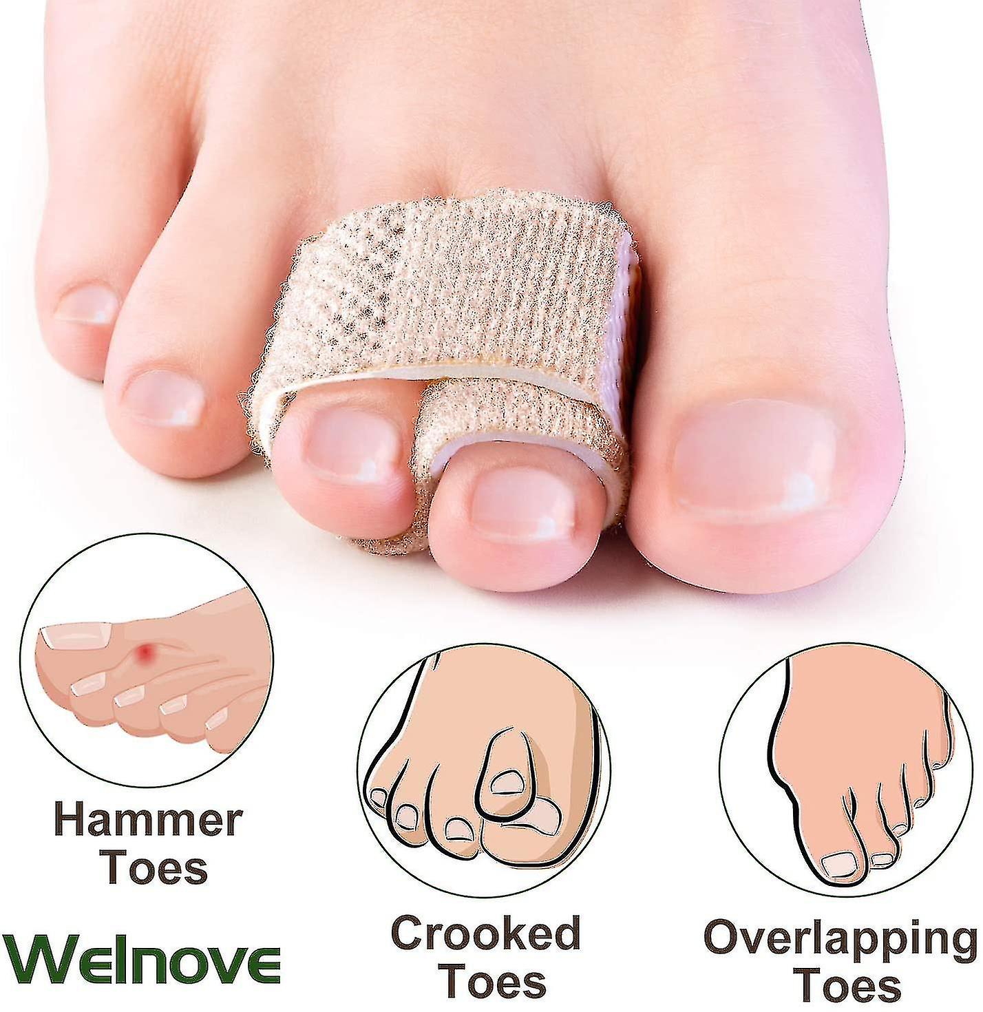 Hammer Toe Protection: The soft fabric wrap cushions straightening and aligning the hammer toe gently for proper positioning and protecting the hammer toe from friction.<br>Support for Overlapping Toe: The soft fabric toe wraps gently separate and readjust the overlapping toes to help stabilize and straighten them.<br>Toe Protection: When your toes get injured, our product can easily wrap your injured toes to minimize movement and promote healing so effectively that it will help protect your toes from secondary trauma.<br>Non-Slip: Lined with a cushioning latex foam layer to provide non-slip while providing cushioning for toes. Use with caution for allergic latex.<br>Material and Package: Including 8 cushioned latex fabric toe wraps easy to clean and reuse.