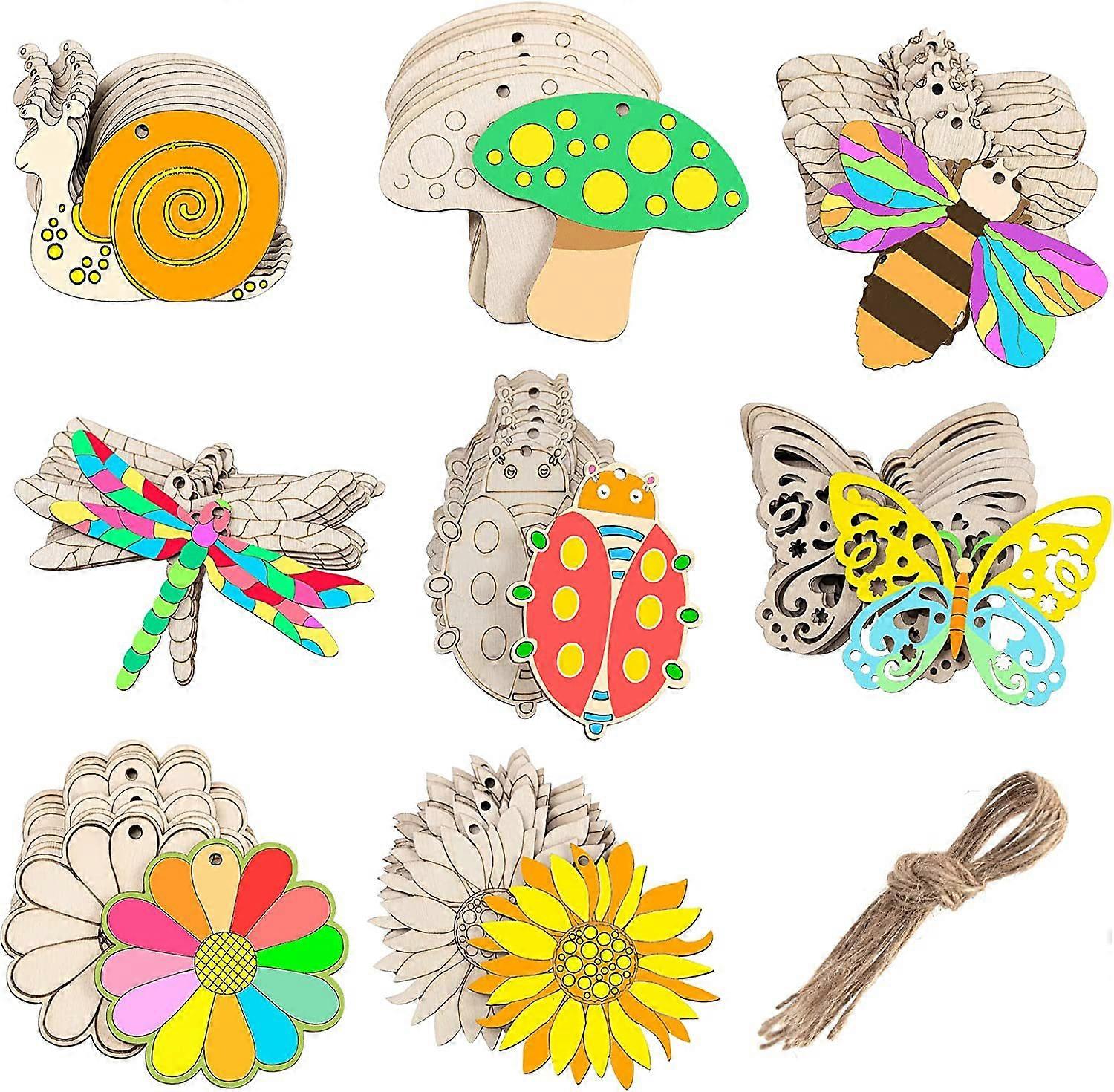 80pcs Unfinished Wood Cutouts Insect Shape Wood Slices DIY Wood Slices Plants Cutouts