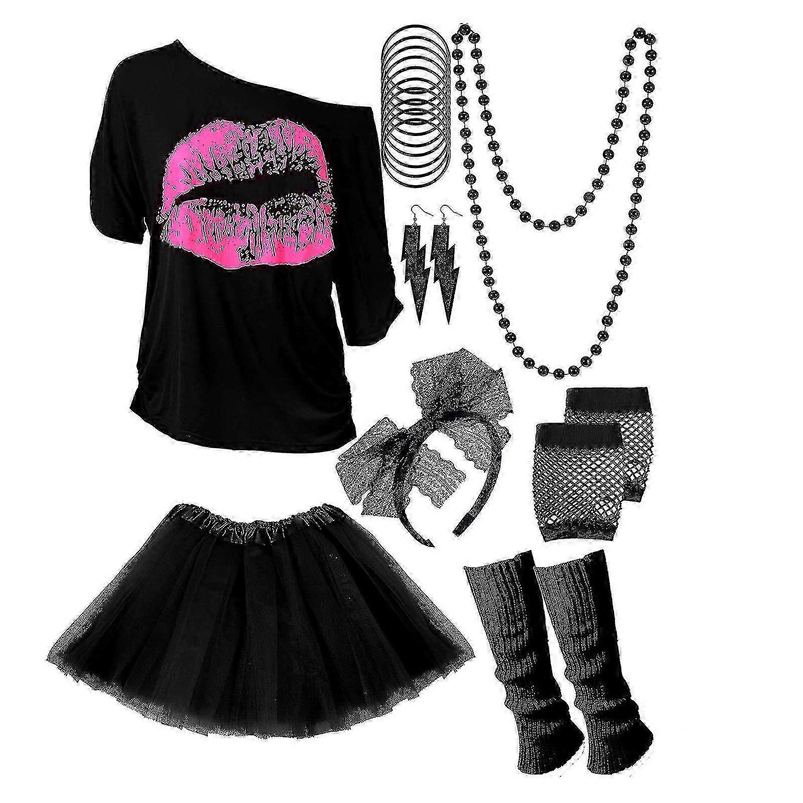 80s 90s Women's Outfit - T-shirt, Leg Warmers, Headband, Earrings, Necklace, Gloves - Perfect For Neon Party, Carnivals, And Costume Parties (s)