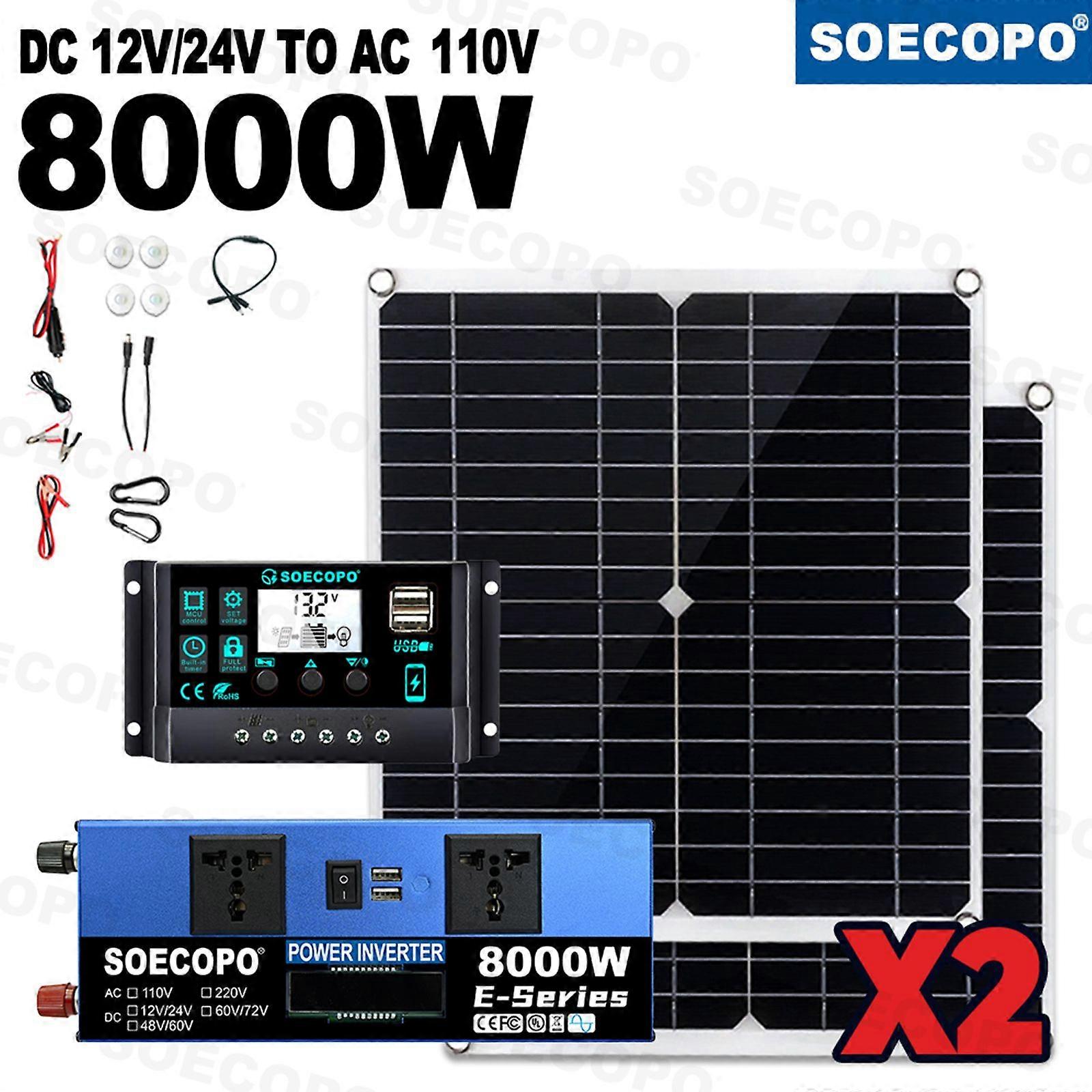 8000W Solar Inverter Kit (12V24V DC to 110V/220V AC) + 2pcs Solar Panels + 100A Controller Sunshine accompanies, worry free electricity ?? SOECOPO 8000W Solar System ? ? Clear function: Light energy to electrical energy+AC/DC conversion, independent power supply for outdoor/emergency scenarios ? Practical help: Covering mobile phone charging, lighting, and household appliance electricity consumption, getting rid of "battery anxiety" ? Core advantages: Portable and easy to install components, intelligent power control for safety, flexible use in 5 major scenarios ??Package Contents ?Solar Panel?? 2 ?SOECOPO Charge Controller?? 1 ?Inverter?? 1 ?Accessories??: 1Controller Alligator Clips 1 2Inverter Alligator Clips 1 3DC Cables 2 4Carabiners 2 5Suction Cups 4 6Car Inverter Cable 1 7User Manual 1 8DC 1-to-3 connection cable (used for connecting two boards) ?? Batteries not included (user-provided). Component configuration and parameters ?? 1 Solar panels ?? Quantity/power: 2 pieces ?? Specification: 280mm 280mm, aluminum substrate+high-efficiency chip+PET material, ??Portable and easy to deploy 2 Inverter ?? Power: peak 8000W, rated 1000W ?? Interface: 5V 1.5A USB+universal socket, supports DC 12V24V input AC 110V/220V output, with intelligent cooling fan ?? 3 Controller ?? Specification: 133mm 70mm, automatically adapted to 12V/24V, 100A charging current, with multiple protection logic ??? Scenario based connectivity solution ?? 1 Quick Deployment 3 Steps ?? Controller connected to battery: DC line+battery clip, distinguishing between positive and negative pole connections Controller connected to solar panel: DC line direct connection, building a light energy collection link Inverter connected to battery: crocodile clip/cable connected to battery, start AC/DC conversion 2 5 practical scenarios ?? ? Emergency charging for mobile phones Connection method: Solar panel USB direct connection Applicable scenario: Recharging electricity in outdoor environments without electricity ? Camping lighting Connection method: solar panel+controller+bulb Applicable scenarios: night campsites, outdoor lighting ? Battery energy storage Connection method: solar panel+controller+battery Applicable scenario: Reserve electrical energy (requires self provided battery) ? Direct supply of household appliances Connection method: battery+inverter+electrical appliance (such as fan) Applicable scenario: Off grid use of low-power household appliances ? Complete off grid system Connection method: solar panel+controller+battery+inverter+electrical appliance Applicable scenario: Building an independent power supply ecosystem ?? Four core reasons for choosing SOECOPO ?? ?? Green and clean: zero emissions from solar energy, saving money and being environmentally friendly ? Full scene adaptation: outdoor/emergency/remote areas, compatible with both large and small appliances ?? Intelligent security: multiple protections+real-time digital display, more secure use of electricity ?? Portable and easy to install: lightweight design+3-step installation, zero foundation and quick start ?? Conclusion: Say goodbye to the troubles of electricity and let the sunshine power you! SOECOPO 8000W Solar Package, Your Mobile Green Power Station ?? ?? Installation and use must read ?? Installation guide: Please refer to the manual for detailed connection steps between the solar panel and the controller. Follow the diagram for more secure operation! ? Operating premise: The controller must be connected to a battery in order to function properly. Without this link, it cannot be started. ?? Power generation conditions: Solar panels need to be exposed to sunlight and should not be placed behind window sills or glass, as obstruction can significantly reduce power generation efficiency! ??? Maintenance precautions: It is forbidden to scratch the surface of the panel with sharp objects. Please take care of it carefully during daily use. ?? Charging points: When using, place the solar panel facing upwards and facing direct sunlight to maximize the charging effect. ??Solar Panel * 2pcs Power Range: 25W - 300W Output: DC 18V + USB 5V Dimensions: 280*280mm ??SOECOPO Charge Controller Voltage: Auto 12V/24V Detection Charging Current: 30A-100A Display: Real-time Voltage/Current Monitoring Operating Temp: -35C to +60C ??Inverter Continuous Power: 1000W Peak Power: 8000W Input: DC 12V/24V Output: AC 220V/110V Efficiency: >90% ??Package list Solar Panel 2 SOECOPO Charge Controller 1 Inverter 1 Accessories: 1Controller Alligator Clips 1 2Inverter Alligator Clips 1 3DC Cables (Red/Black) 2 4Carabiners 2 5Suction Cups 4 6Car Inverter Cable 1 7User Manual 1