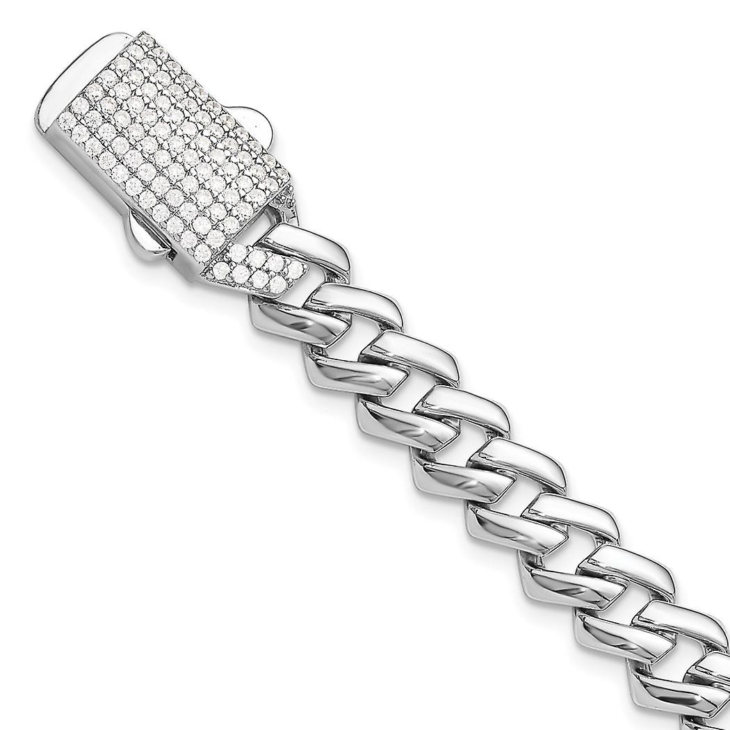 8.6mm Sterling Silver Rhodium-plated Monaco Link Cubic Zirconia Pave Clasp Bracelet - 7.5 Inch - 19.4 Grams In Sterling Silver in Plated Metal - - Width of Item: 8.6 mm - Length of Item: 7.5 in - Chain Length: 7.5 in - Chain Width: 8.6 mm - Clasp /Connector: Box Catch - Finish: Polished - Chain Type: Link-Other - Clasp Width (Female end): 20.9 mm - - [ Potential Enhancement Methods: cubic zirconia ] - Synthetic. Some are covered with a product that makes the stone more durable. - [ Care and Handling: cubic zirconia ] - Clean with warm soapy water and a soft cloth. -