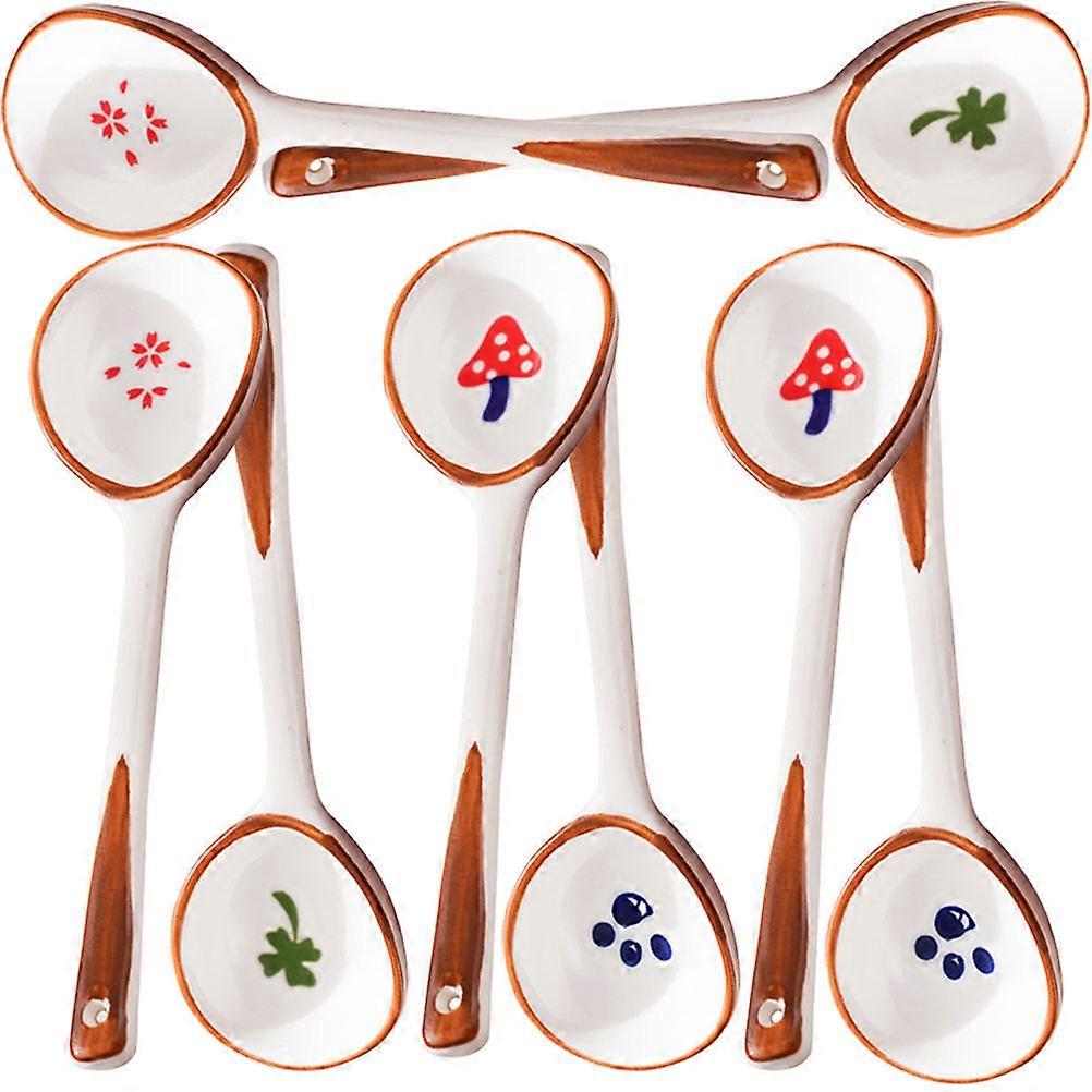 8pcs Long Handle Ceramic Soup Spoons for Food Serving Cartoon Design, Safe Material, Multi Color (Blue, Pink, Green, Red) for Soup, Porridge &