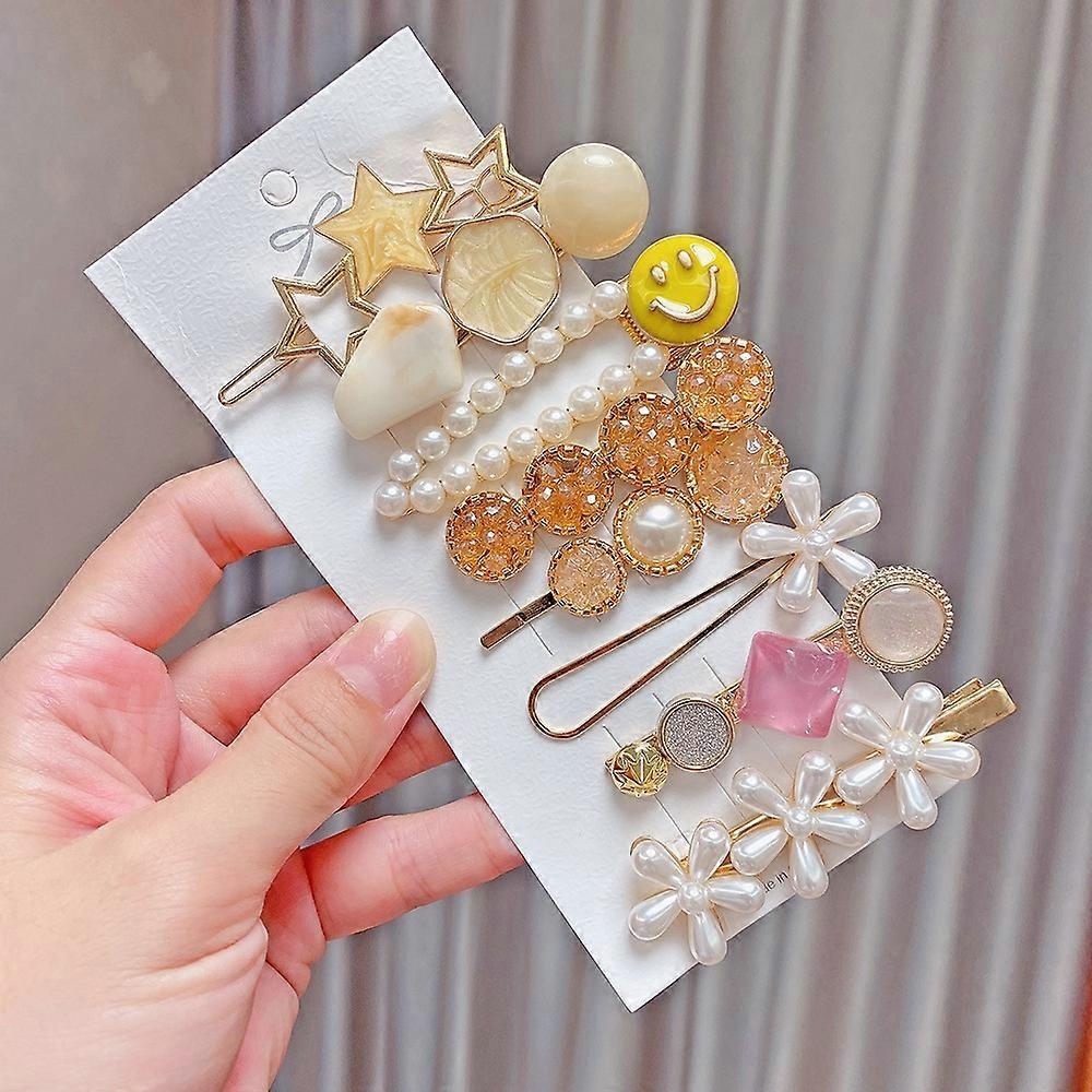 8PCS/Set Yellow Alloy Colorful Hairpin Headgear Pearl Rhinestone Clip Set
